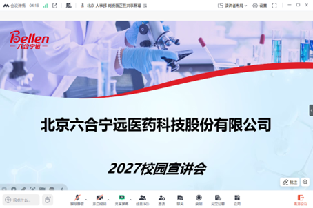 为搭建药学专业学子与优质医药企业的精准对接桥梁,4 月 1 日,北京六合宁远有限公司药学院实习就业专场宣讲会以腾讯会议线上形式成功举办。公司人事部刘晓薇担任主讲人,药学院 2026 届全体毕业生及 2027 届部分实习生线上齐聚,共同参与这场职业赋能交流活动。