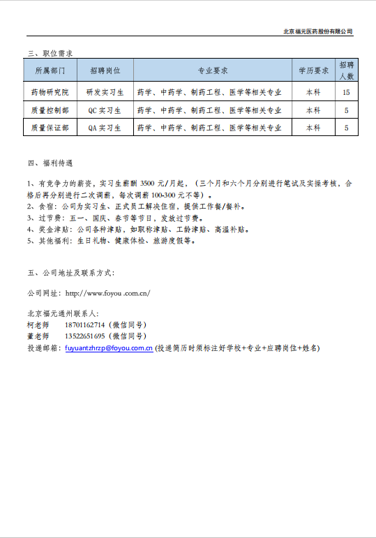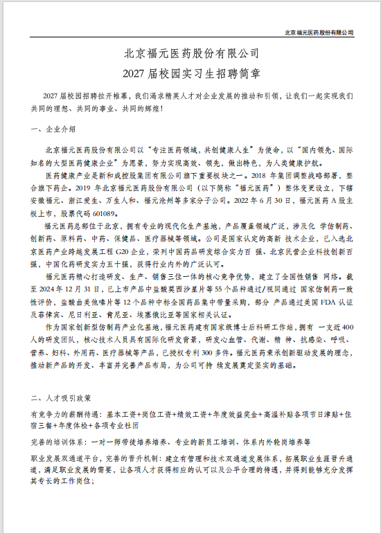 北京福元医药股份有限公司 2027 届校园实习生招聘简章
