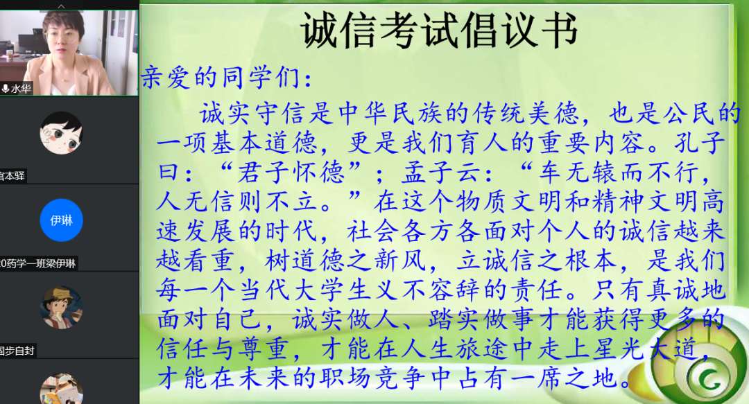 为营造良好的学习氛围,引导青年学生讲诚信、树诚信、践诚信,弘扬社会主义核心价值观,增强学生的诚信意识及纪律意识,6月15日至17日,药学院各年级在辅导员老师的组织下,通过钉钉、腾讯会议等形式在线上开展了诚信考试主题班会。