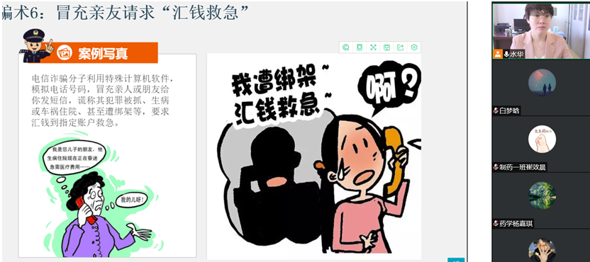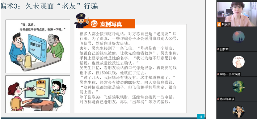 我院组织学生关注安装“国家反诈中心”APP,积极在微信朋友圈、微信群组等平台转发反诈宣传视频,扩大宣传覆盖面,形成互联网现象级传播效应。积极开展“无诈校园、无诈班级、无诈宿舍、无诈家庭”创建活动。各年级辅导员组织开展线上宣传主题讲座四次。对案件易发、高发人群进行精准针对性宣防,保证宣传鲜活性和持久性,培养和发现一批优秀宣传员,为全院开展打击治理电信网络新型违法犯罪宣传工作积蓄力量,奠定基础。