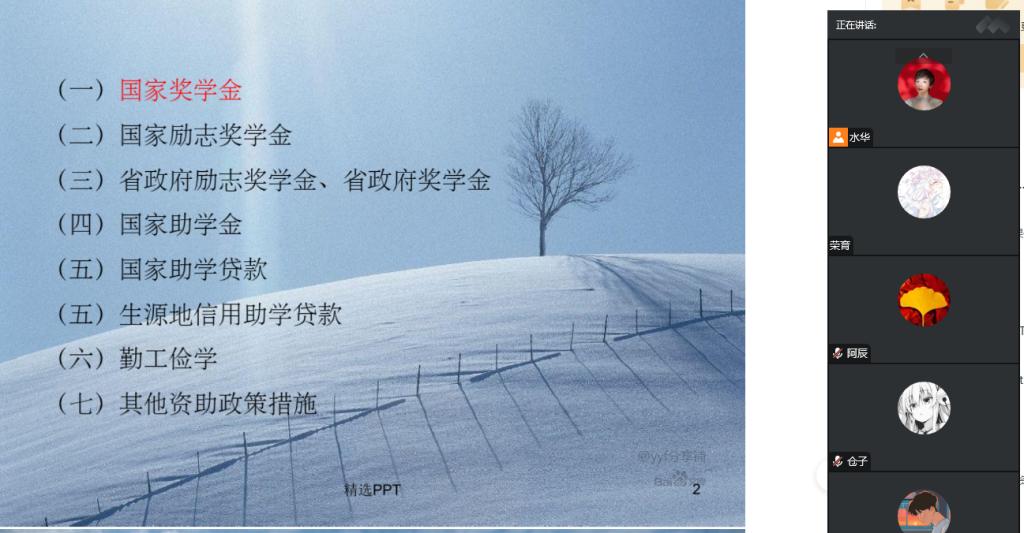 加深2022级新生对学校资助政策的了解,给家庭经济困难的学子提供有效帮助,确保新生在入学前、入学时、入学后“三不愁”,2022年10月10日下午,药学院学工办闫水华老师面向2022级全体新生开展了线上学生资助政策解读专题讲座。