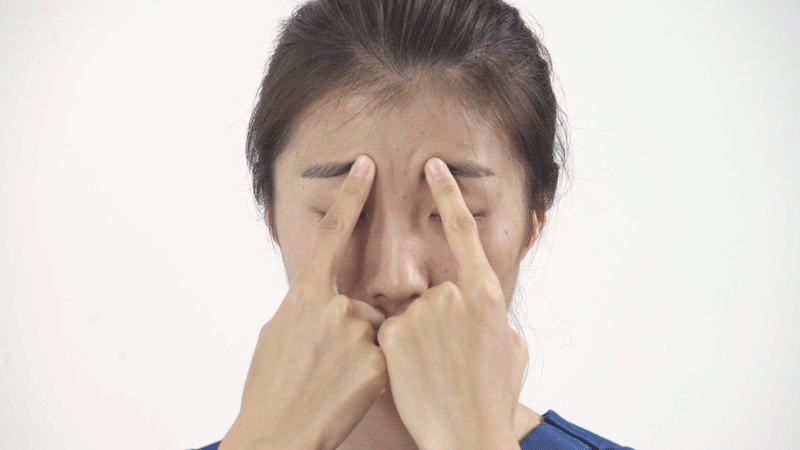 攒竹穴位于两眉头起始端,双手指腹以打圈的方式由外向内进行按揉,按揉的力度应适中。