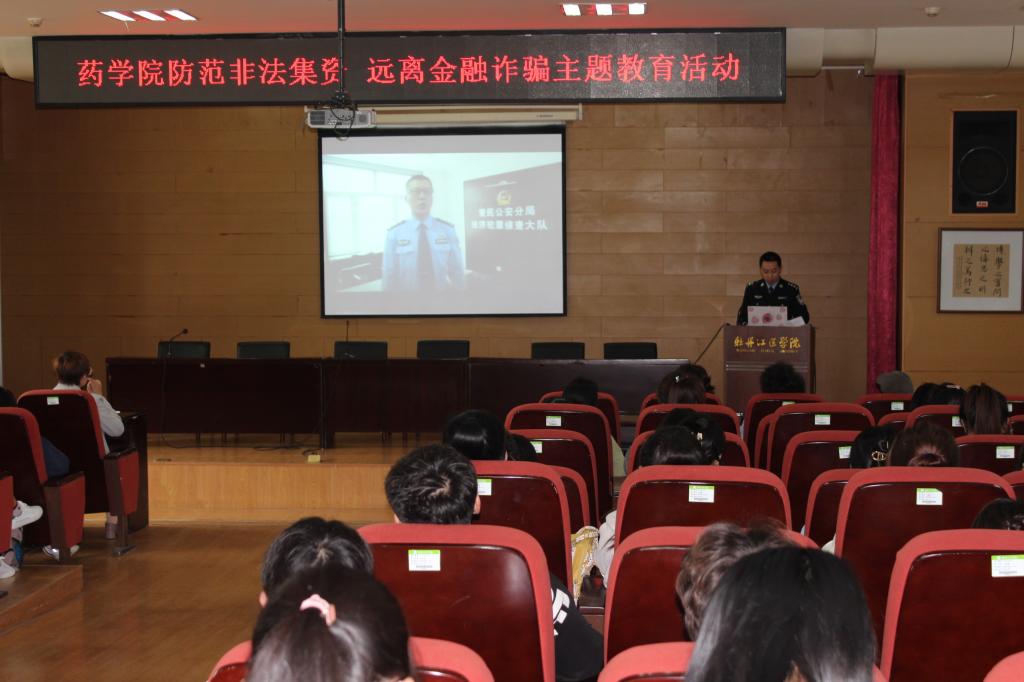 为进一步普及金融知识,提高广大师生对非法集资、电信诈骗及非法金融的防范意识和识别能力,积极营造平安和谐校园环境。2023年5月15日,药学院邀请牡丹江市公安局爱民分局经侦大队三级警长王凯波开展防范非法集资、电信诈骗及非法金融知识进校园宣传教育活动,帮助广大学子“守住钱袋子 护好幸福家”,现场200余名学生聆听了专题讲座。