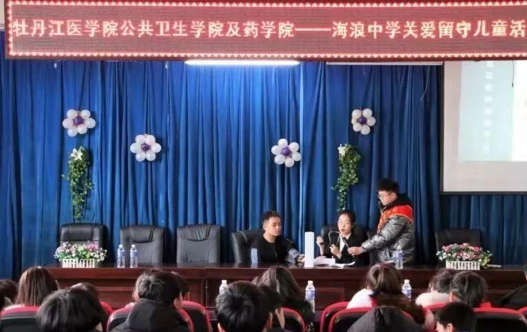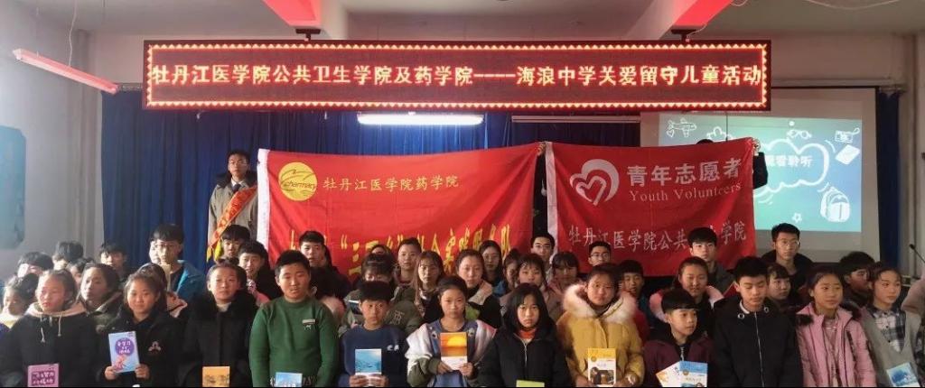 2019年11月27日,由牡丹江医学院药学院团委和公共卫生学院团委首次联合开展的关爱留守儿童志愿服务活动正式拉开帷幕。在药学院团委周成铭老师和公共卫生学院团委邱泽航老师的带领下,30名大学生志愿者,驱车一小时来到海浪中学,看望留守儿童。