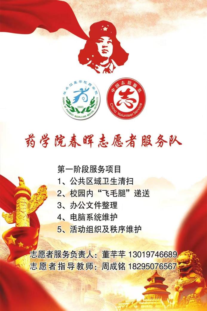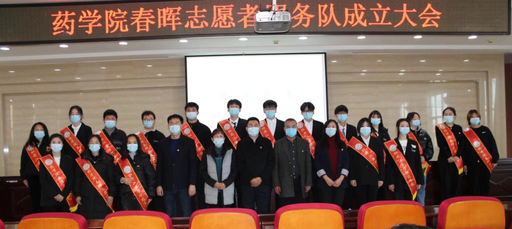 青春有担当,志愿正当时。“春晖”志愿者服务队正式成立,标志着药学院志愿服务工作进入一个新的发展时期。今后,药学院“春晖”志愿服务队将围绕学校及学院中心工作,扎实开展各项志愿服务,全面助力学校、学院高质量发展,奋进新征程、建功新时代。