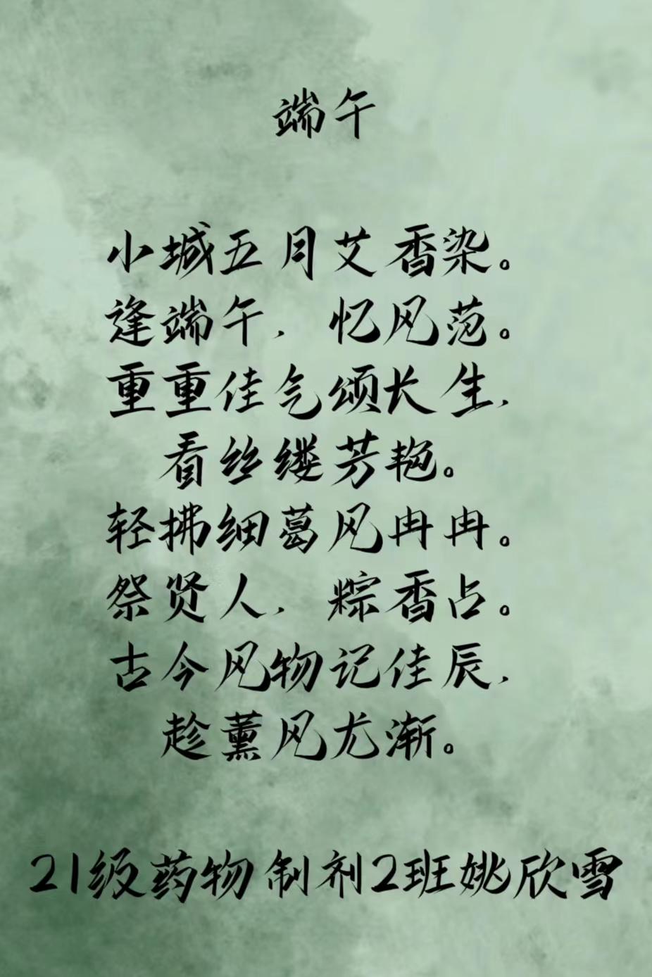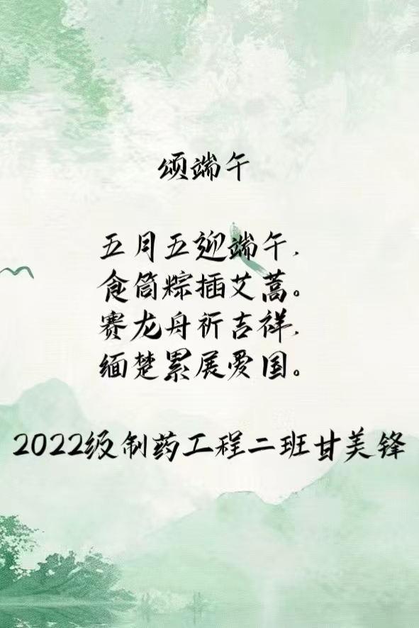 为弘扬中华民族优秀传统文化,引导广大师生厚植家国情怀,药学院开展“我们的节日”系列——“诗韵端午 传承经典”端午节主题诗词征集活动。 经过各团总支动员,共有40余名选手提交参赛作品。大家充分发挥自身的文学功底,创作出众多与端午节相关的诗词作品。这些作品有的描绘了端午节的传统习俗,如包粽子、赛龙舟等;有的则表达了对屈原精神的敬仰与追思;还有的展现了对传统文化传承的热情与决心。学院经过客观评选,最终共有5名选手的优秀的诗词作品脱颖而出。这些作品不仅展示了我院学生的文学天赋,更体现了学生们对端午节这一传统节日的深刻理解和独特感悟。以下是5位同学的作品:21级药剂2班姚欣雪,23级药剂2班杨建秋,23级制药4班李羽,22级药剂1班陈宇豪,22级制药2班甘美锋。