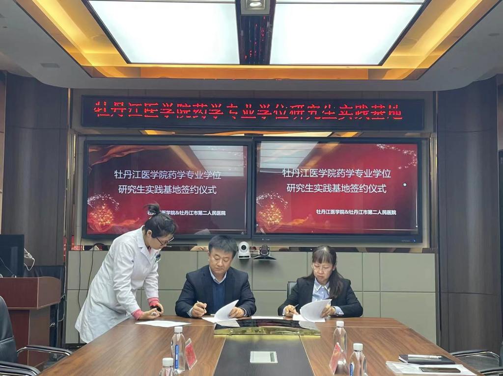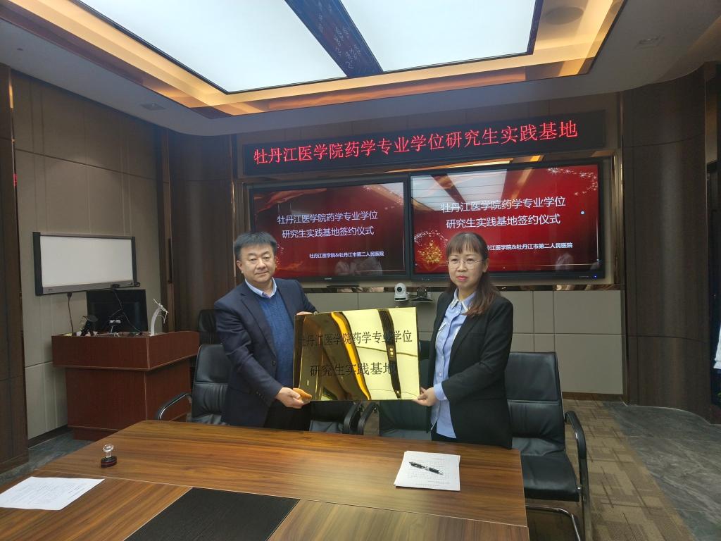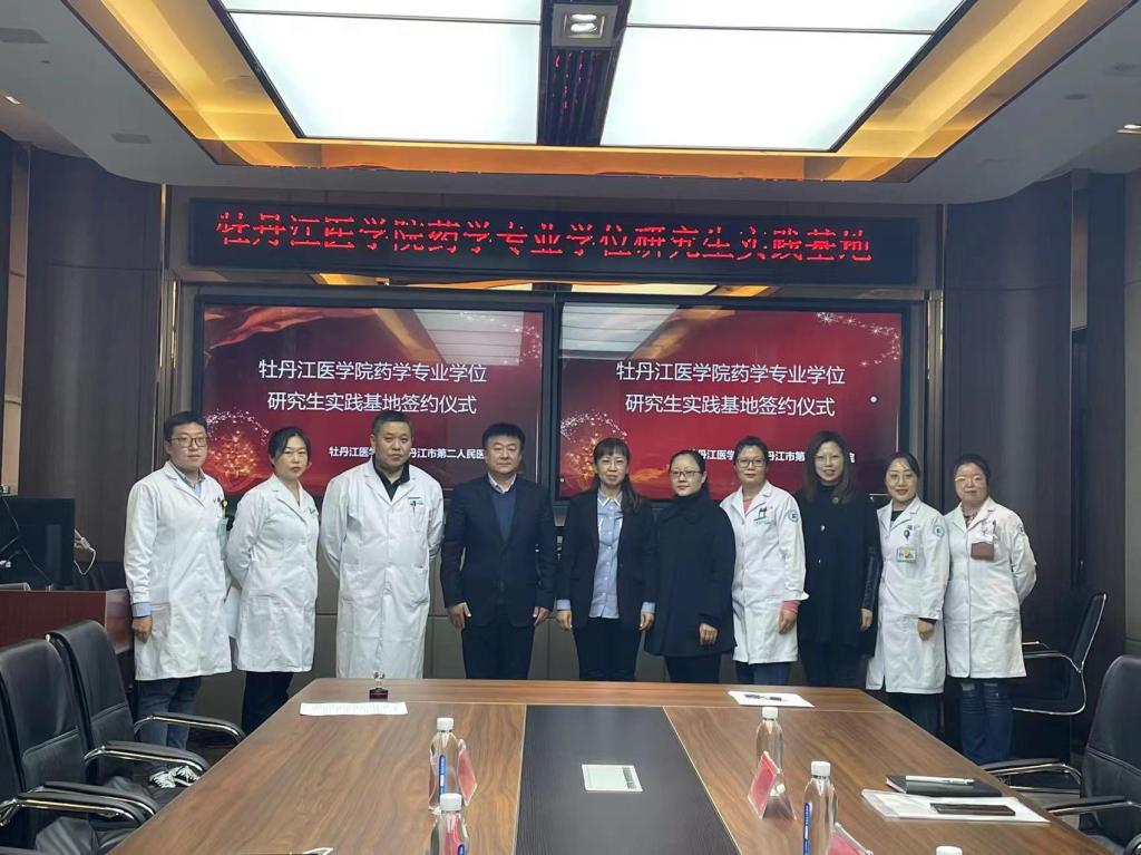 近日,牡丹江医学院药学专业学位研究生实践基地签约仪式在牡丹江市第二人民医院举行。牡丹江第二人民医院院长张效宇、副院长周兆海、药学部主任夏维、药学部副主任翟金凤、基地秘书刘珍、药学部带教老师以及牡丹江医学院药学院院长翟凤国、副院长曹艳丽、科研与研究生培养科科长刘佳维参加了本次签约授牌仪式。