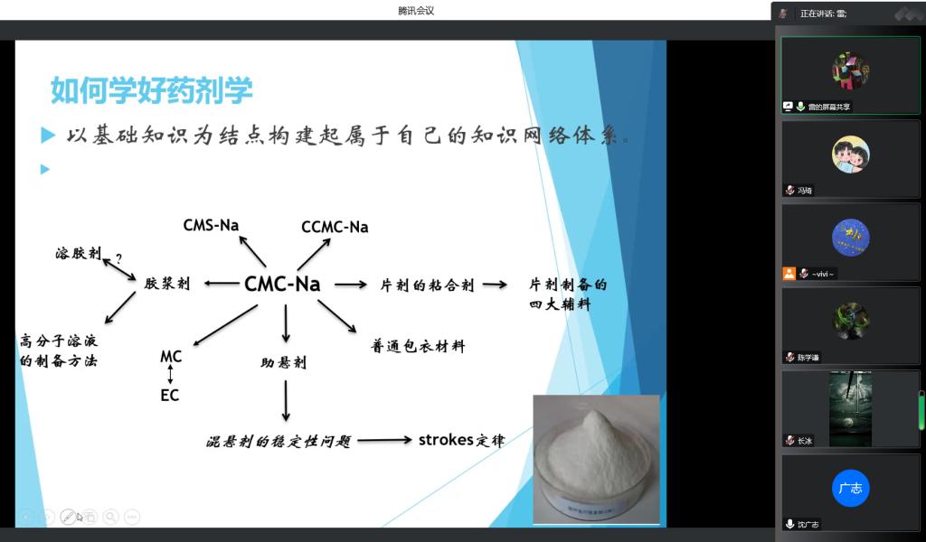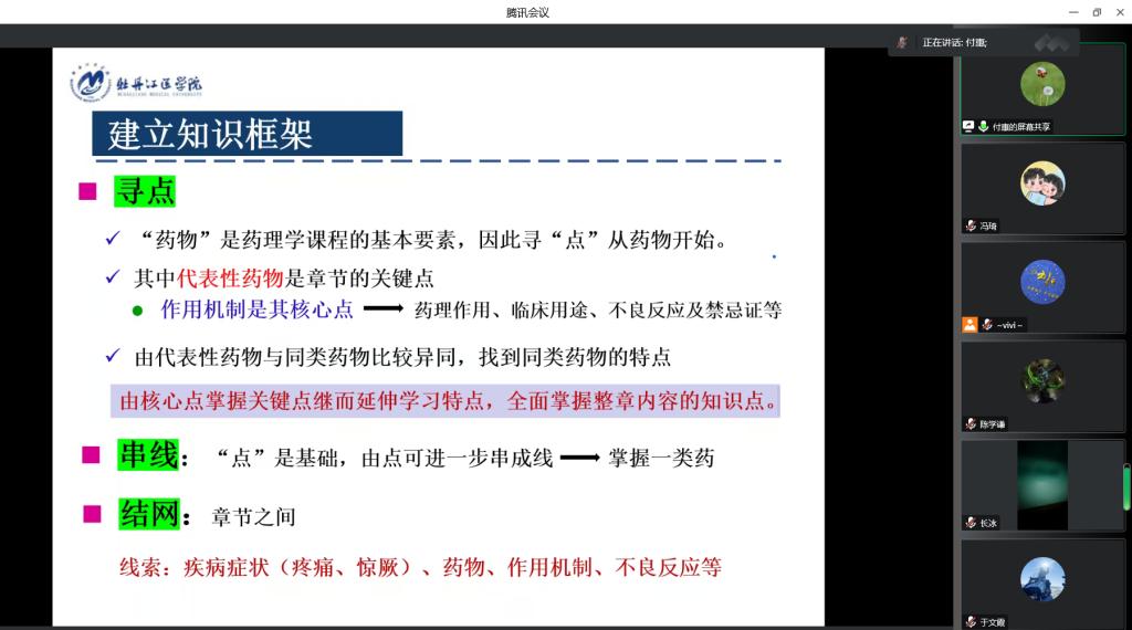 会上,药学院老师们针对药理学、药物化学、药剂学学科的重点、难点进行解析。药理学教研室付惠老师表示药理学是药学与基础医学与临床医学的桥梁课程,想要学好药理学,需要建立好知识框架,寻点串线结网,从而全面掌握药理学内容的知识点。药物化学教研室沈广志老师以阿司匹林为例,引出先导化合物的发现、优化、药物分子修饰的过程,积硅步以致千里,积懈怠以致深渊,希望大家可以持续努力。药剂学教研室佟雷老师以PEG为例,根据药剂学基质的特点对各种剂型的制备方法构建知识网络展开讲解。