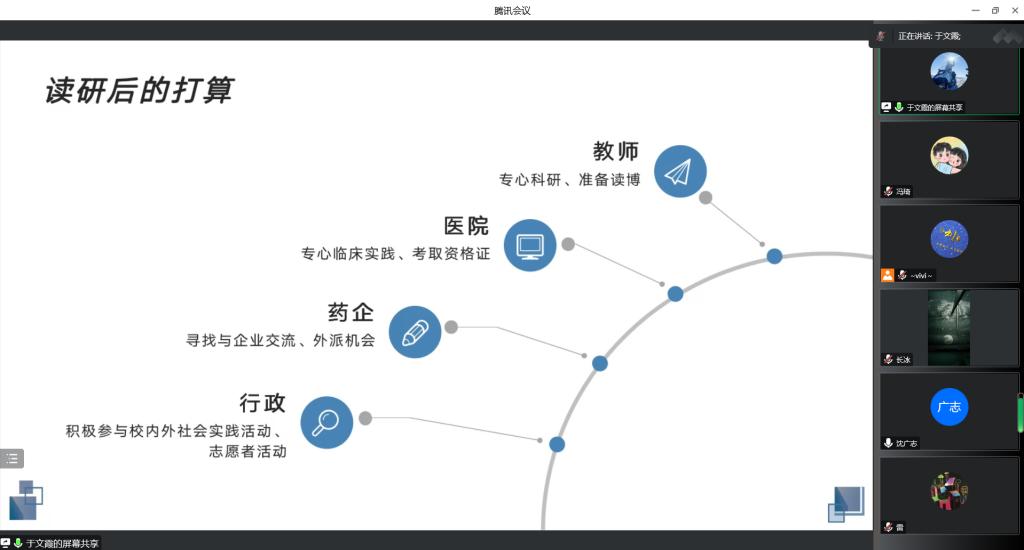 随后,由两位药学专业的硕士研究生进行考研经验分享,2020级研究生于文霞针对专业选择、学校选择、专业课学习、以及读研后的打算进行经验分享。2022级研究生冯琦根据考研复习的时间点对专业课的题型、分值、复习重心进行经验分享。