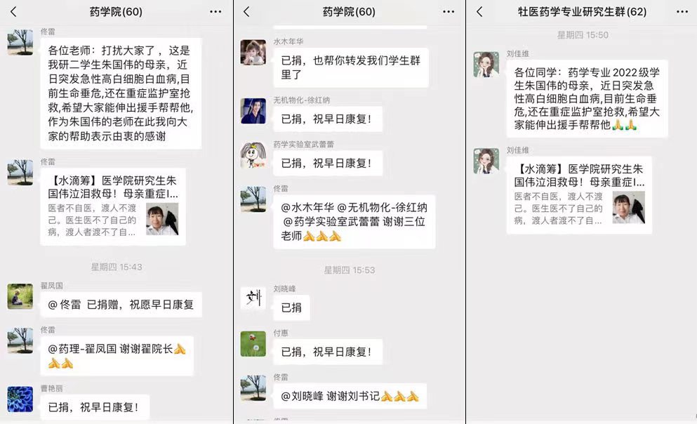 8月16日,药学院2022级研究生朱国伟的母亲出现发烧胸闷等症状,速就诊于临沂市人民医院,被诊断为高白细胞白血病,紧接着出现急性呼吸衰竭,休克等症状,并在重症监护室中抢救。面对巨额的治疗费用和未知的移植费用,整个家庭陷入困境。