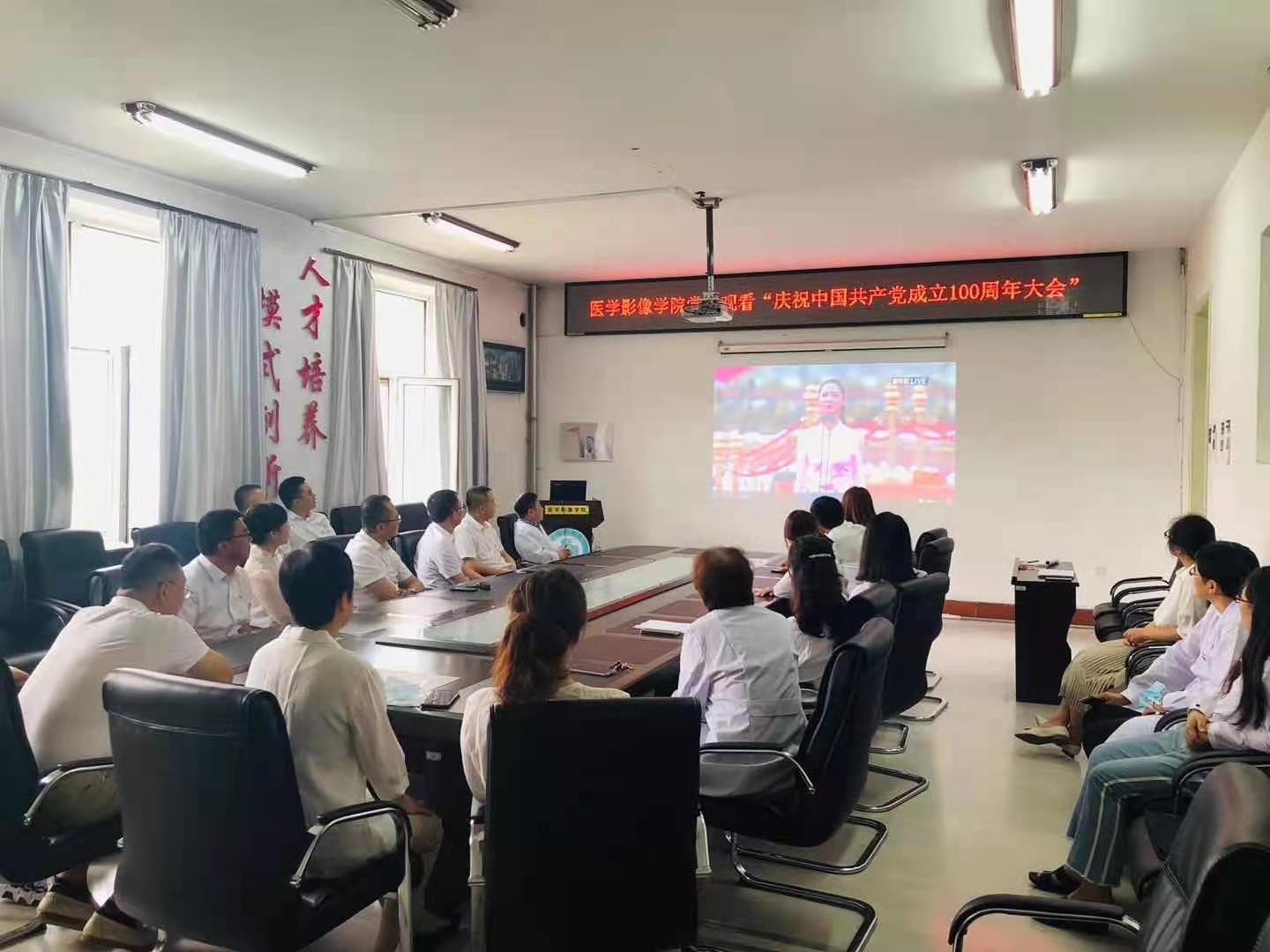 百年岁月风华正茂,历经风雨未见沧桑。2021年7月1日,迎来中国共产党百年华诞,医学影像学院党委组织全院党员教师在影像楼3楼会议室集中观看“庆祝中国共产党成立100周年大会”现场直播,领导班子五名成员,全体教师党员参与本次会议。