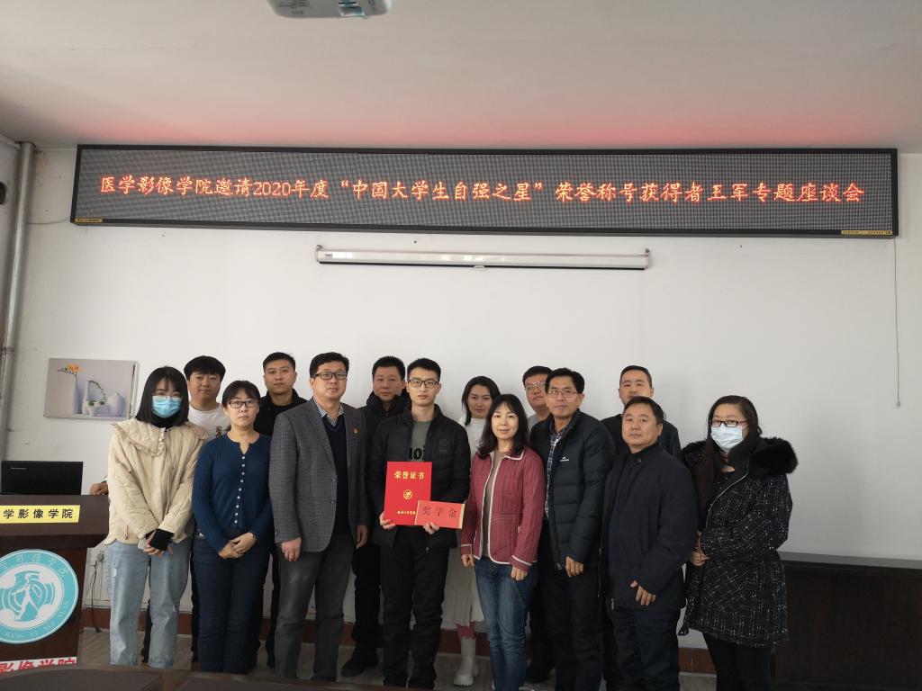 2021年12月17日上午,医学影像学院邀请2020年度“中国大学生自强之星”荣誉称号获得者王军召开专题座谈会,医学影像学院党委书记潘艳明、院长邢健、专职组织员杨昕宇、副院长周志尊及各党支部书记、辅导员、2020年度“中国大学生自强之星”荣誉称号获得者王军等参加了座谈会。座谈会由学工办主任宋海南主持。