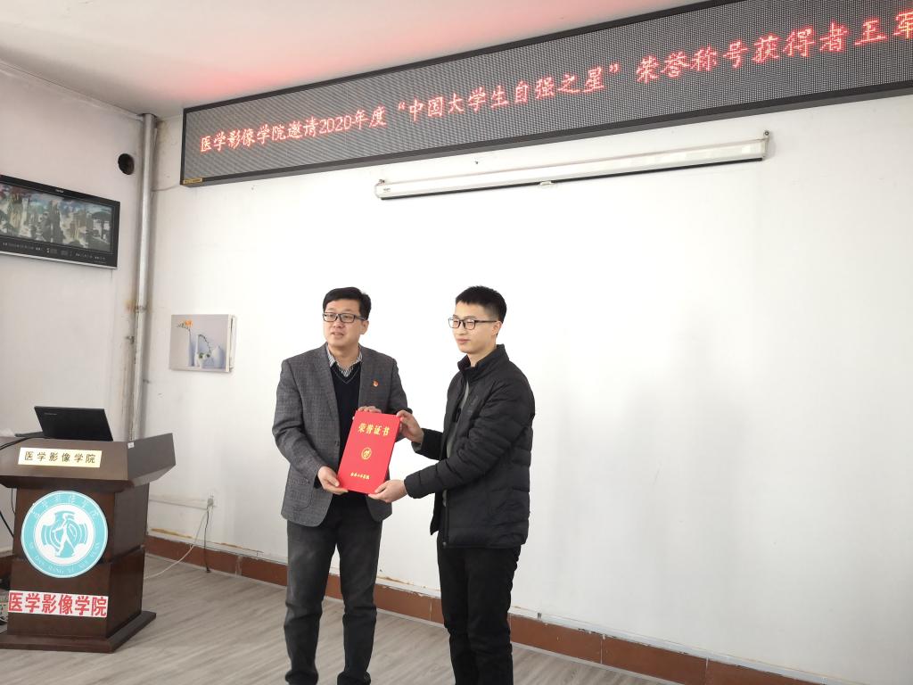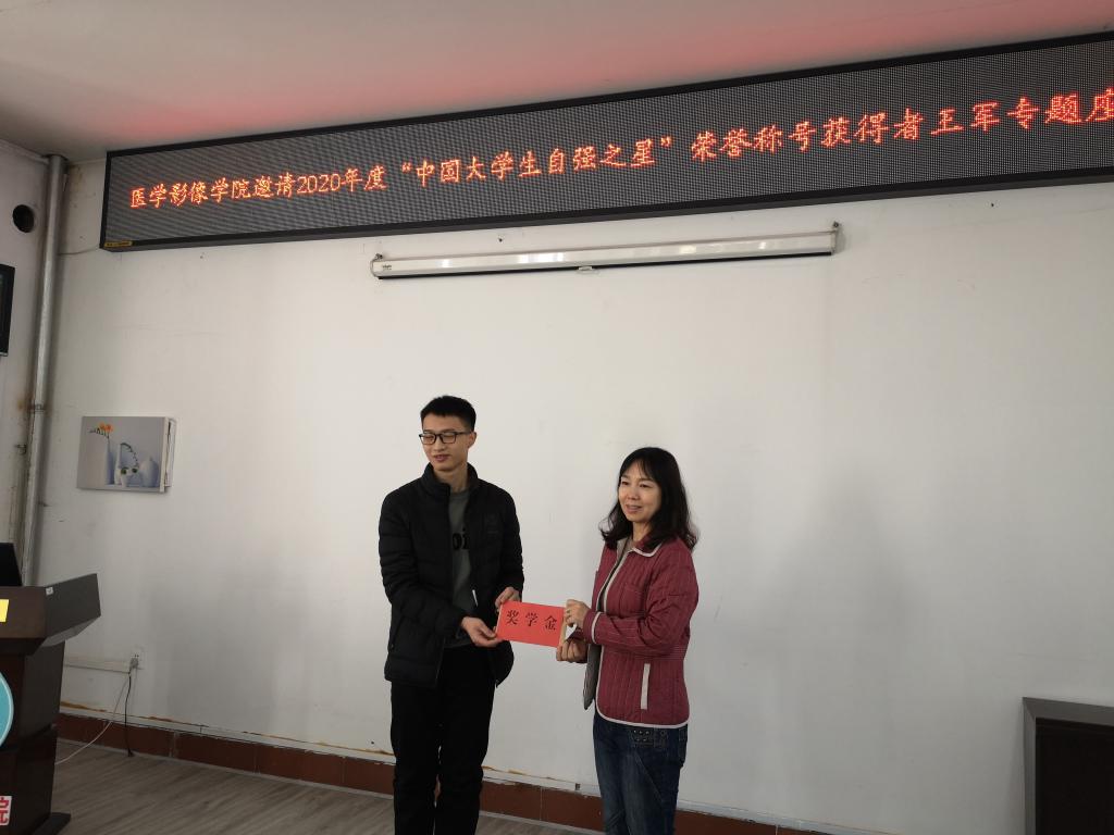 最后,潘艳明、邢健分别为王军颁发了荣誉证书和3000元奖学金,鼓励王军同学在未来的生活学习中自强不息,再接再厉为学院增光添彩。王军感谢学院对自己的培养、关爱与支持,会向着更高更远的目标继续奋进,为学校建设高水平医科大学和学院的发展贡献自己的力量。