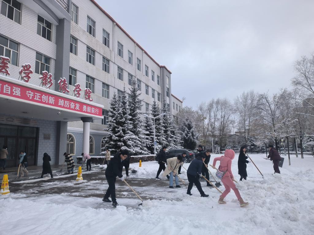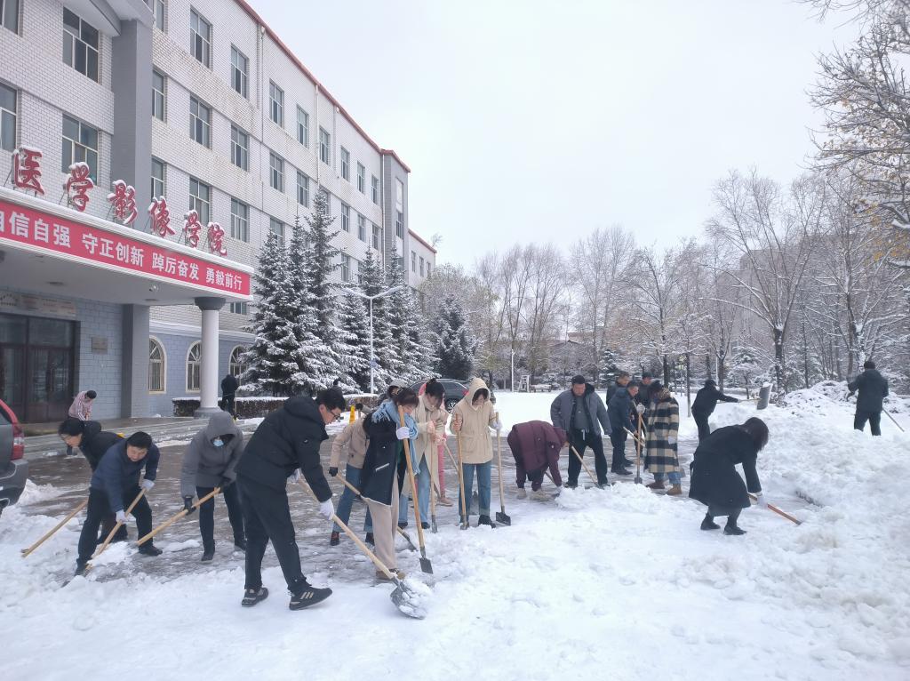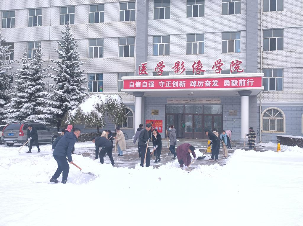 伴随着2023年11月5日-6日的第一场强降雪,校园告别了晚秋的枯黄,裹上了美丽的银装,雨雪混杂的降水也给校园交通和师生出行带来了不便,为保障师生出行安全、维护学校正常教学秩序,11月7日上午,医学影像学院党委倡议全体无课教职工到影像办公楼前开展清理冰雪活动。