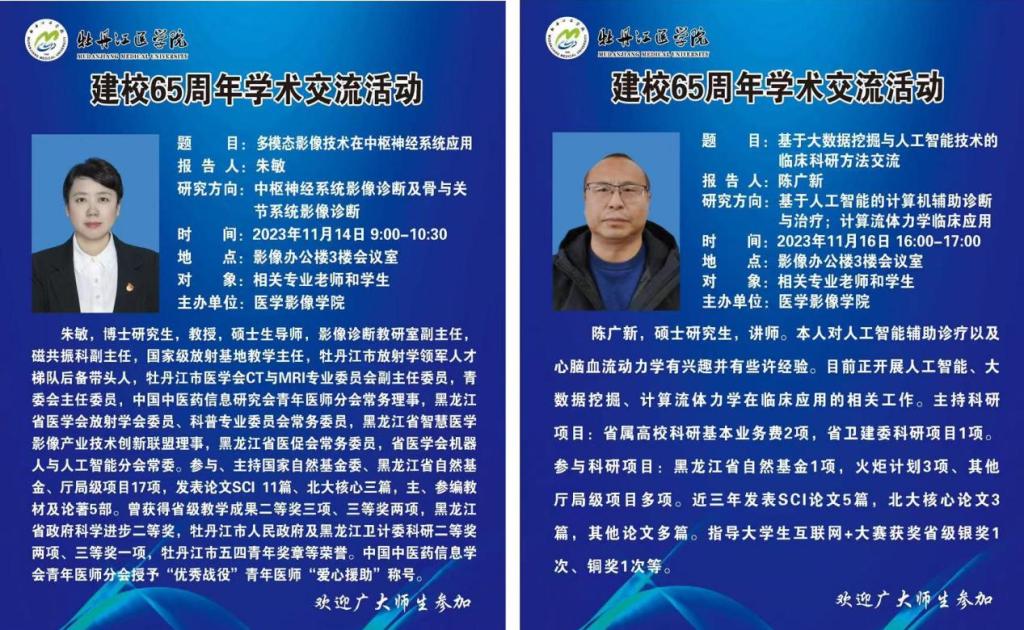 在建校65周年之际,学院通过开展系列讲座,既为教师和学生搭建了学术交流的平台,也提升了医学影像学院的学术氛围,获得了师生们的热烈反响!