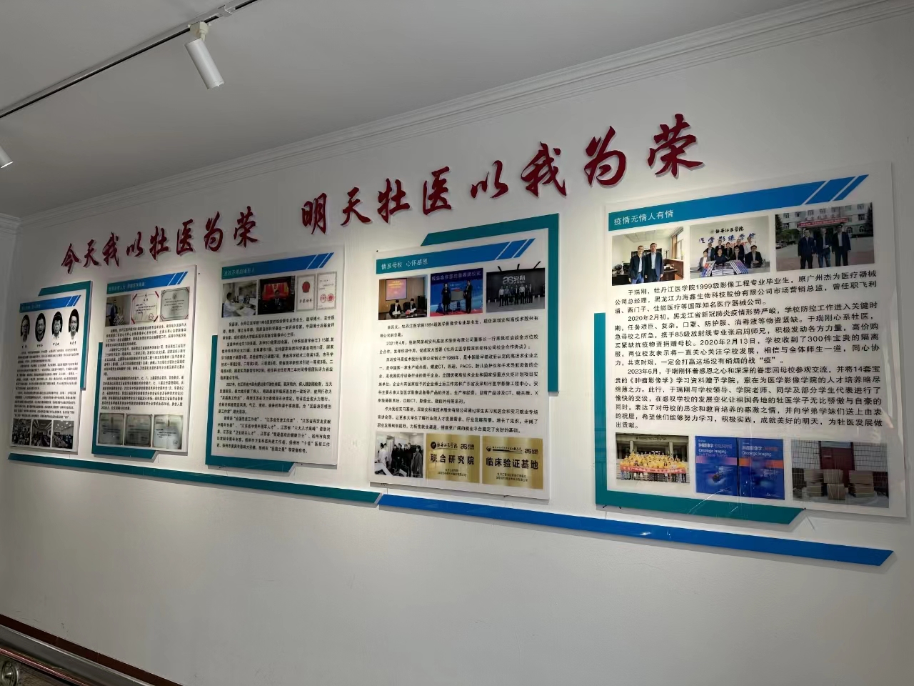 为进一步加强我院学生思想教育工作,引领广大青年学生不负使命,脚踏实地,怀抱梦想,奋力前行,学院党委精心打造思想育人新阵地,购建了医学影像学院思想政治教育展厅。展厅以李波先生等四位专业奠基人和历届优秀毕业生为蓝本,他们中有全国先进工作者、有博士生导师、有全国专业委员会副主委、业务精湛的中国好医生;有不惧疫情不畏枪林弹雨完成国家使命的工程师、有在异国他乡尽职尽责没能与母亲最后告别的援非医生;还有无偿捐赠多台大型医疗设备、在学校新冠肺炎最艰难时刻第一时间伸出援助之手的企业总裁和优秀毕业生,他们的奋斗历程、奉献精神、高尚品质,是牡医优良传统继承和发扬的生动体现,是对学生进行思想政治教育的宝贵精神财富。
