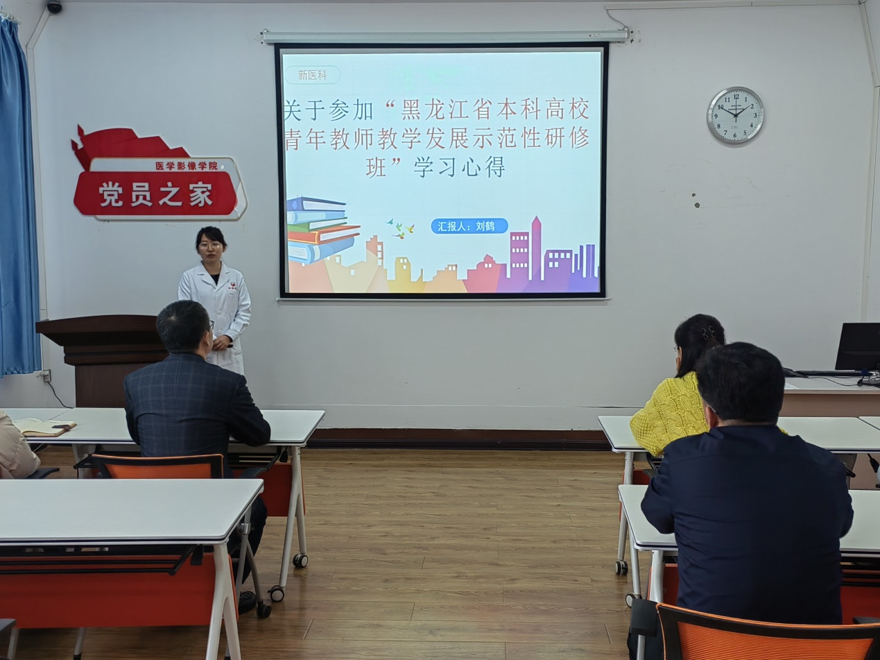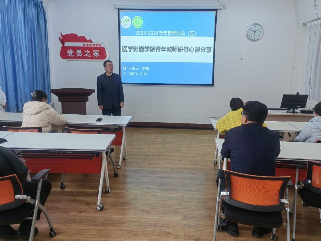 2023年12月19日13时30分,医学影像学院在党员之家举办2023-2024学年教学沙龙系列活动第五期,本期由影像诊断学教研室刘鹤老师主讲,主题为“医学影像学院青年教师研修心得分享”,活动由医学影像学院副院长于广浩主持,医学影像学院党委书记潘艳明、院长邢健及无课教师参加活动。