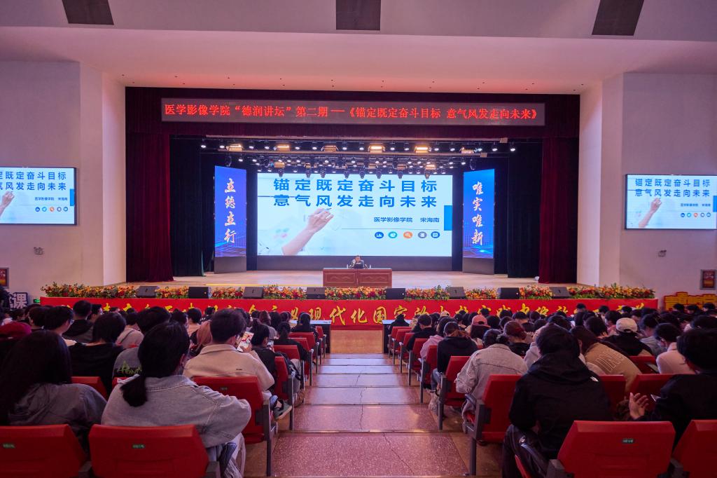 为扎实做好职业生涯规划和实习培训教育工作,进一步提升我院学生就业综合竞争力,促进就业育人高质量发展。医学影像学院于6月3日在文体馆举办了第二期“德润讲坛”,主讲人为我院副处级辅导员宋海南,题目为《锚定既定奋斗目标 意气风发走向未来》,我院近千名学生参加本次活动。讲座从实习分配、就业形势、毕业去向等方面进行讲解,旨在帮助同学们锚定奋斗目标,合理规划职业生涯,意气风发走向未来。