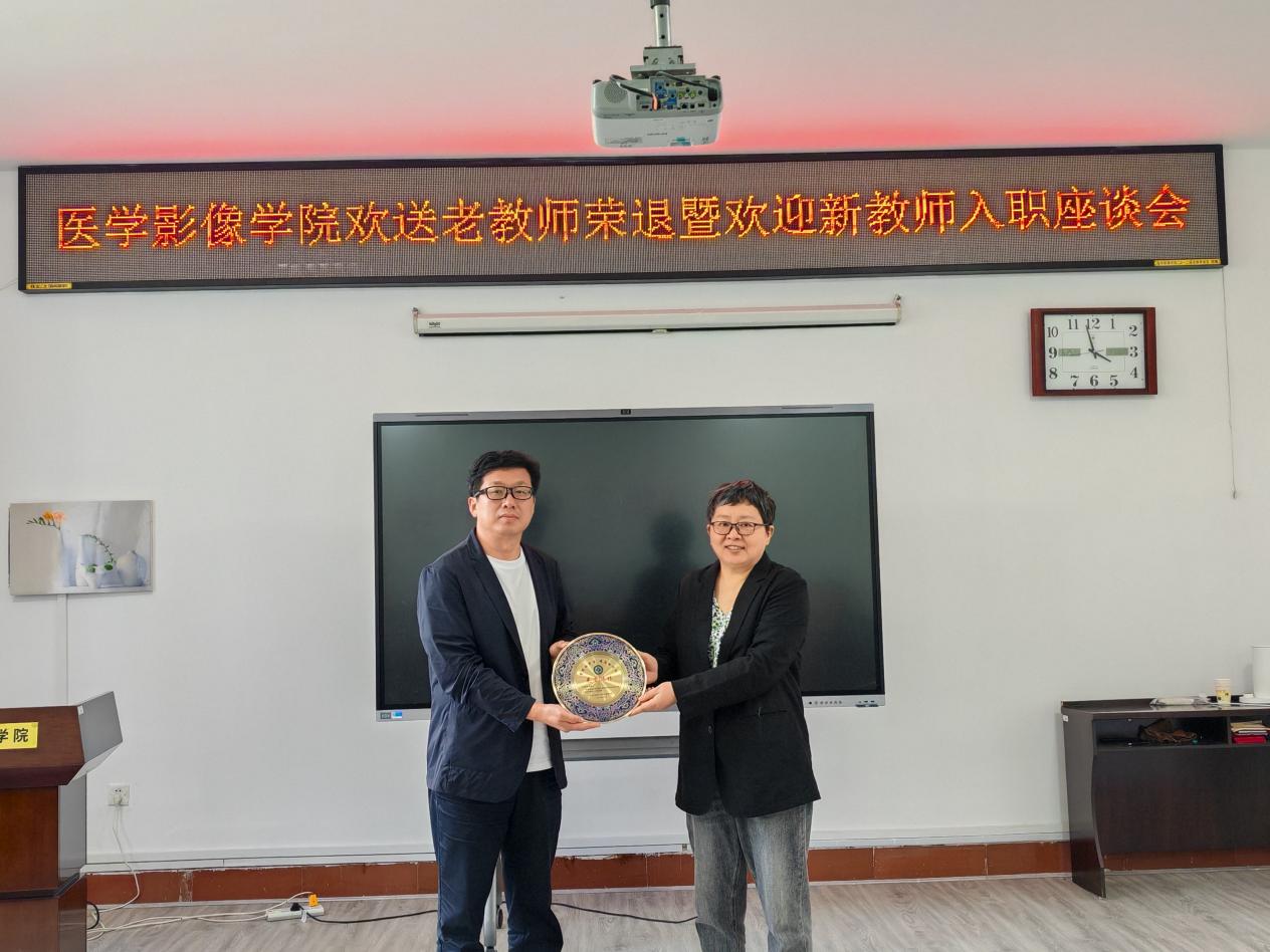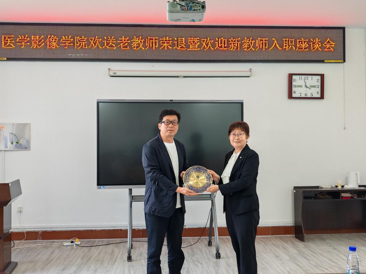 潘艳明代表医学影像学院为光荣退休的徐春环老师、李秋丽老师赠送退休纪念盘。对两位老师表达了崇高的敬意和衷心的感谢,感谢他们多年来为学院发展、学科建设、人才培养等方面做出的卓越贡献,希望两位老师继续发挥传帮带的作用,为学院的发展建言献策。同时,也对张思瑾、李英翰、韩京轩三位年轻教师的加入表示热烈欢迎,希望新入职教师积极进取、勇于创新,为学院的未来发展注入新的活力与动力。