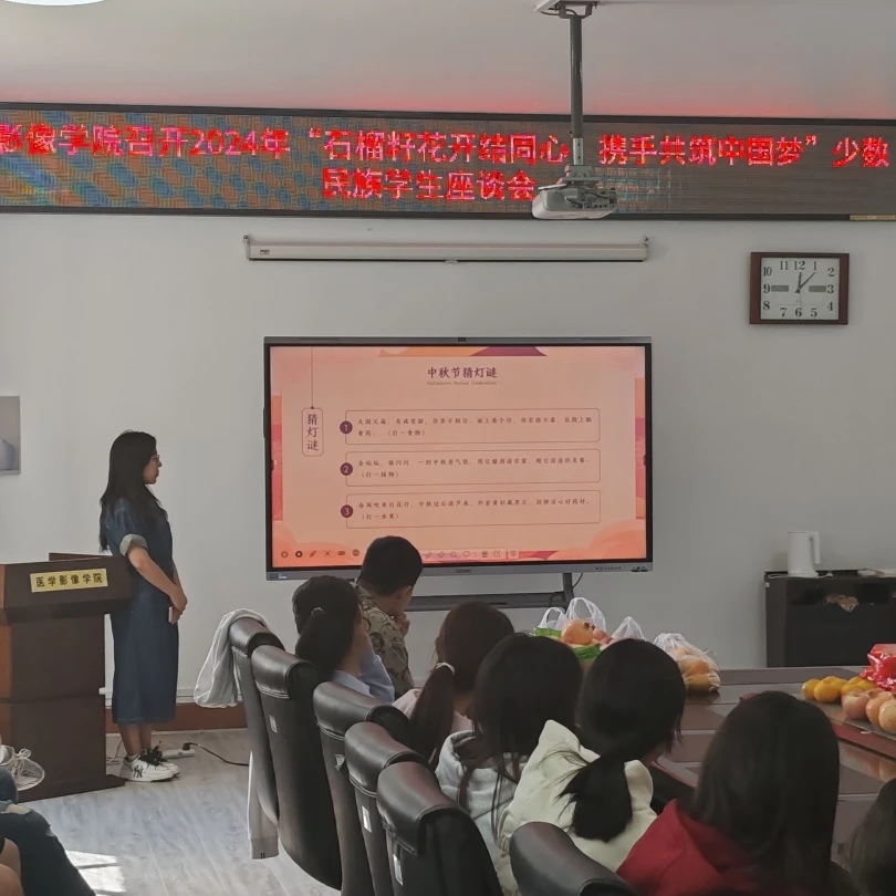 为深化新时代大学生的民族团结教育,激发爱国主义情感,大力弘扬中华民族传统节日和优秀文化,全面铸牢中华民族共同体意识,2024年9月13日,医学影像学院开展了“石榴籽花开结同心,携手共筑中国梦”少数民族学生座谈会主题活动。2022级辅导员彭博伟、李殿威老师和2022级全体少数民族在校生参与本次活动。