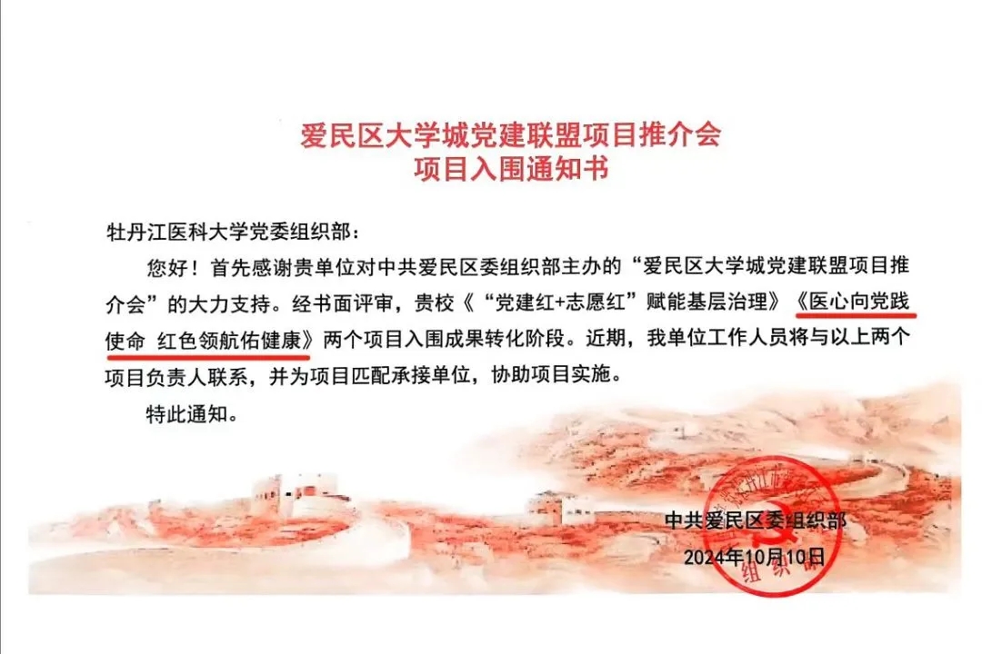 为进一步统筹推进高校和爱民区基层党组织结对共建,激发大学城党建联盟活力,赋能高质量发展提供坚强组织保障,切实增强驻区大学生对爱民区区情、社情的了解,为大学生提供更多社会实践平台,激发大学生创新创业热情,推动高校创新项目成果转化,把党组织的政治优势、组织优势转化为发展优势,实现共建、共享、共赢的最终目标,中共爱民区委组织部发布了《关于举办大学城党建联盟项目推介会的预通知》。活动得到了驻区各高校,爱民区乡镇街道及区直相关部门的广泛关注和积极参与,经高校推荐、联合评审,医学影像学院《医心向党践使命 红色领航佑健康》项目成功入围。