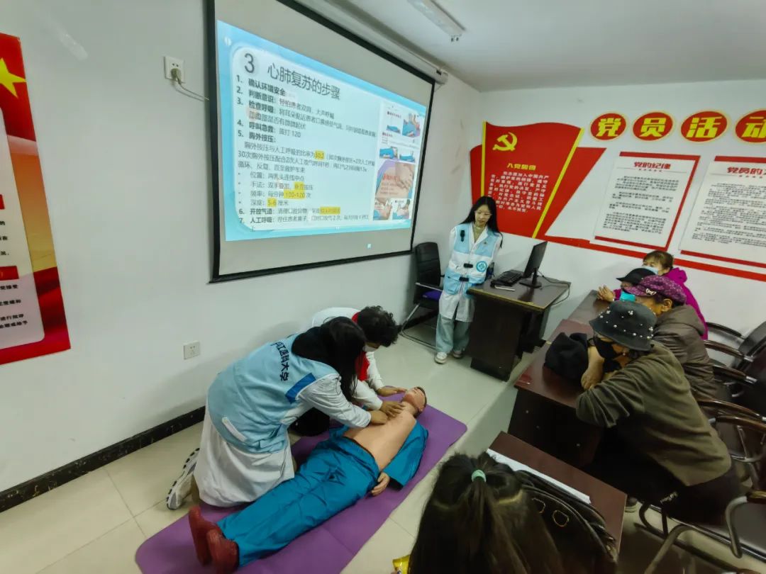 在“医务宣传”活动环节,志愿者们主要围绕心肺复苏和季节性流行病相关知识进行普及宣讲。在讲解心肺复苏术的步骤时,志愿者采用理论和实践相结合的方式,并在现场逐步进行了标准操作示范,现场居民在志愿者的指导下进行了实操练习,对胸外按压、人工呼吸等进行实战演练,现场沉浸在一片浓厚的学习氛围中,居民们反映热烈,纷纷表示通过学习急救知识不仅能有效增强了在面对紧急情况时应急处理能力,通过把所学知识分享给家人朋友,还可能在关键时刻挽救生命,为后续救治赢得宝贵时间。
