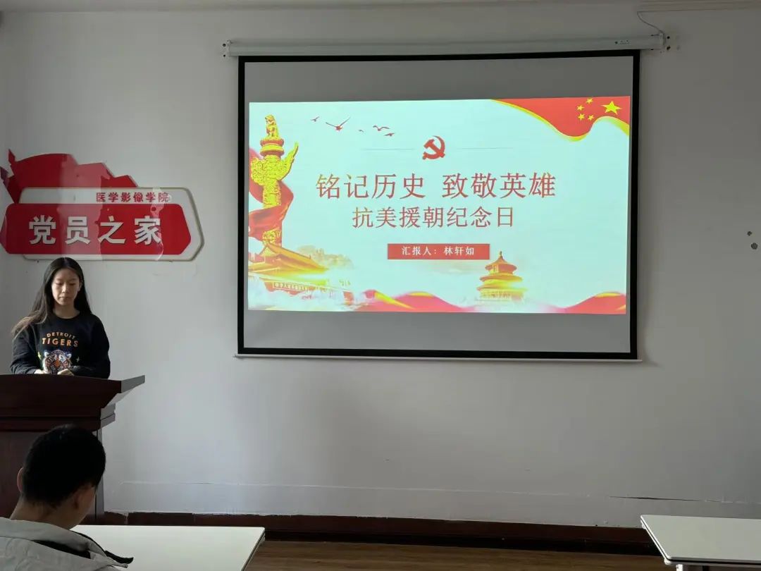 随后,学生第三党支部林轩如讲述了抗美援朝纪念日,并向大家介绍了杨根思和解秀梅两位英雄。正如习近平总书记所强调的,“英雄是民族最闪亮的坐标”。杨根思、解秀梅等人的英雄事迹,正是抗美援朝精神的生动体现,它告诉我们,无论时代如何变迁,抗美援朝精神永远值得我们铭记和传承。一个民族的精神力量,可以在长期的历史进程中不断积淀和释放,在紧急关头、关键时刻则会爆发出磅礴伟力。抗美援朝战争奏响了一曲气壮山河的英雄赞歌,锻造了跨越时空、历久弥新的抗美援朝精神。