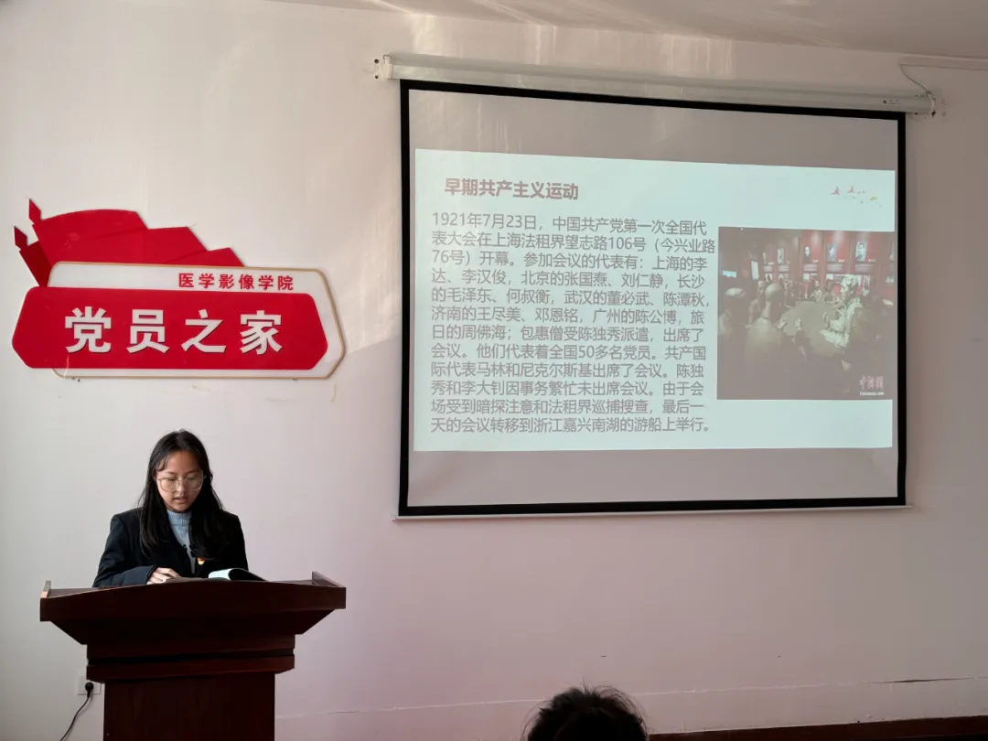青年兴则国家兴,青年强则国家强。为了重温党的光辉历史,继承和发扬党的优良传统和作风,增强党员的理想信念,提升党组织的凝聚力和战斗力,坚定青年大学生以信仰之光指引前行,以初心如磐凝聚奋斗力量,传承红色精神,用实干的脚步稳步前行,凭奋斗的精神开创美好未来。2024年11月13日中午,医学影像学院在党员之家开展了第十一期"讲好百年党史 激发奋进力量"学生党员讲党史主题活动,学生第二党支部组织委员杨笑乙主持活动,学院所有在校学生党员出席此次活动。