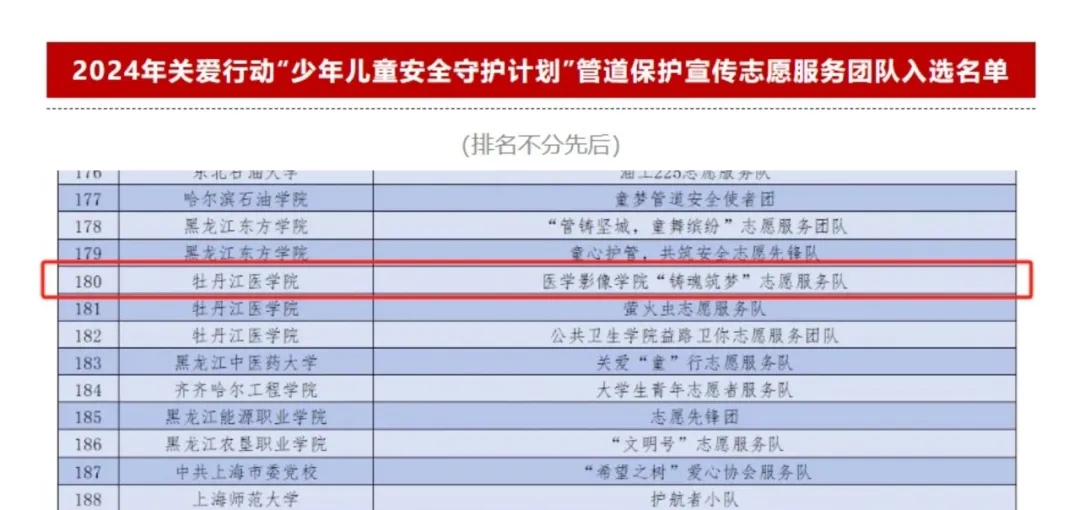 为全面贯彻党的二十大和二十届二中、三中全会精神,提升国家石油天然气管道沿线公众“不伤害管道、不被管道伤害”的管道保护意识和自我防护能力,筑牢油气管道安全“人民防线”,组织动员青年志愿者参与油气管道保护宣传,团中央青年志愿者行动指导中心、中国青年志愿者协会秘书处面向全国高校遴选2024年关爱行动“少年儿童安全守护计划”管道保护宣传志愿服务团队,牡丹江医科大学医学影像学院“铸魂筑梦”志愿服务队通过积极申报成功入选!
