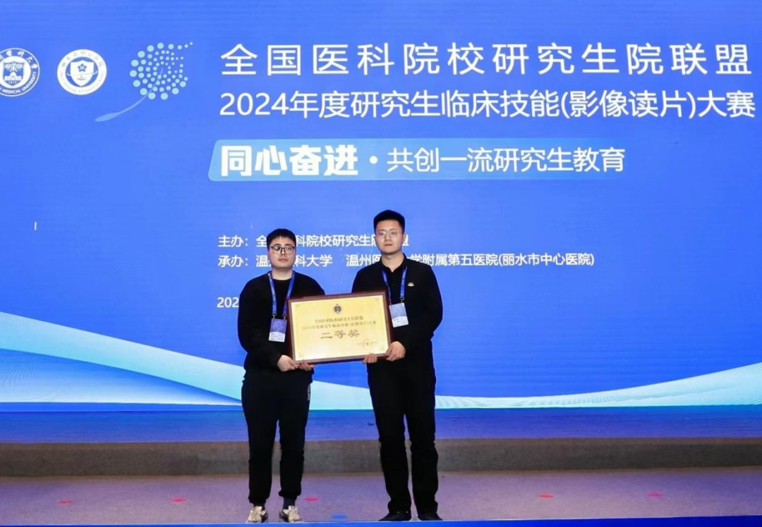2024年11月23日,由全国医科院校研究生院联盟主办的2024年度研究生临床技能(影像读片)大赛在温州医科大学附属第五医院落下帷幕。全国有近50所医科院校研究生代表队参赛,经过预赛、复赛、决赛三个阶段的激烈角逐,我校由医学影像学院2022级放射影像学专业学位硕士研究生梁龙、赵立新组建的牡丹江医科大学代表队,奋勇拼搏、稳扎稳打,最终以全国总排名第5的优异成绩,获得2024年度研究生临床技能(影像读片)大赛“二等奖”。