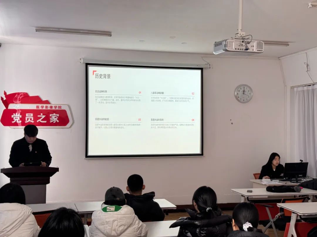为深入贯彻落实习近平总书记关于党史学习教育的重要讲话精神,持续推进党史学习走深、走实,帮助学生党员全面了解党的光辉历程和伟大成就,深化学生党员对党的历史的学习,培养学生党员的综合素质与党性修养,传承红色基因与革命精神,增强学生党员的历史责任感。2024年11月27日中午,医学影像学院在党员之家开展了第十三期"讲好百年党史 激发奋进力量"学生党员讲党史主题活动,学生第二党支部组织委员杨笑乙主持活动,学院所有在校学生党员出席此次活动。