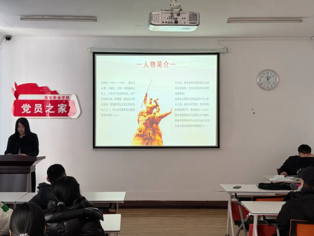 随后,黄骞慧从人物简介、人物生平、主要成就、后世纪念四个部分对抗日英雄杨靖宇进行了介绍。杨靖宇将军的一生是革命的一生,战斗的一生,辉煌的一生。他率领东北抗日联军在林海雪原的艰苦环境中与日寇血战,为全民抗战建立了具有战略意义的功绩。他以草根棉絮充饥,战斗到最后一刻的气概,更在亿万人民心中树起不朽的丰碑。