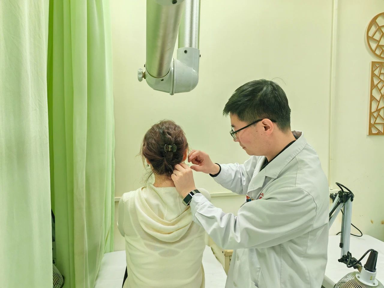 在令人期待的互动体验环节,顾主任先为大家示范肩颈按摩推拿手法及八段锦—两手攀足固肾腰式,帮助缓解长期伏案工作导致的肩颈不适、放松全身肌肉。教师们积极跟练体验后赞叹连连,纷纷感受到肩背放松伸展舒适。大家还体验了神奇的中医针灸艾灸和耳穴压豆等体验项目,只见顾主任谈笑之间已将针灸针刺入穴位,袅袅艾香弥漫在空气中也令人神清气爽,刺激耳部穴位来调节身体机能也是一种新奇尝试。顾主任和护士长李雅洁一边操作,一边耐心介绍针灸艾灸的功效,如温通经络、散寒除湿、缓解疼痛等,让大家对中医传统疗法有了更直观的认识。在场教师纷纷表示,通过这次亲身体验,深刻感受到了中医的博大精深,希望有机会能够更深入了解祖国传统医学。活动最后,顾主任科室还为每位教师赠送了养生香囊,让大家把中医智慧携在身边余香环绕。