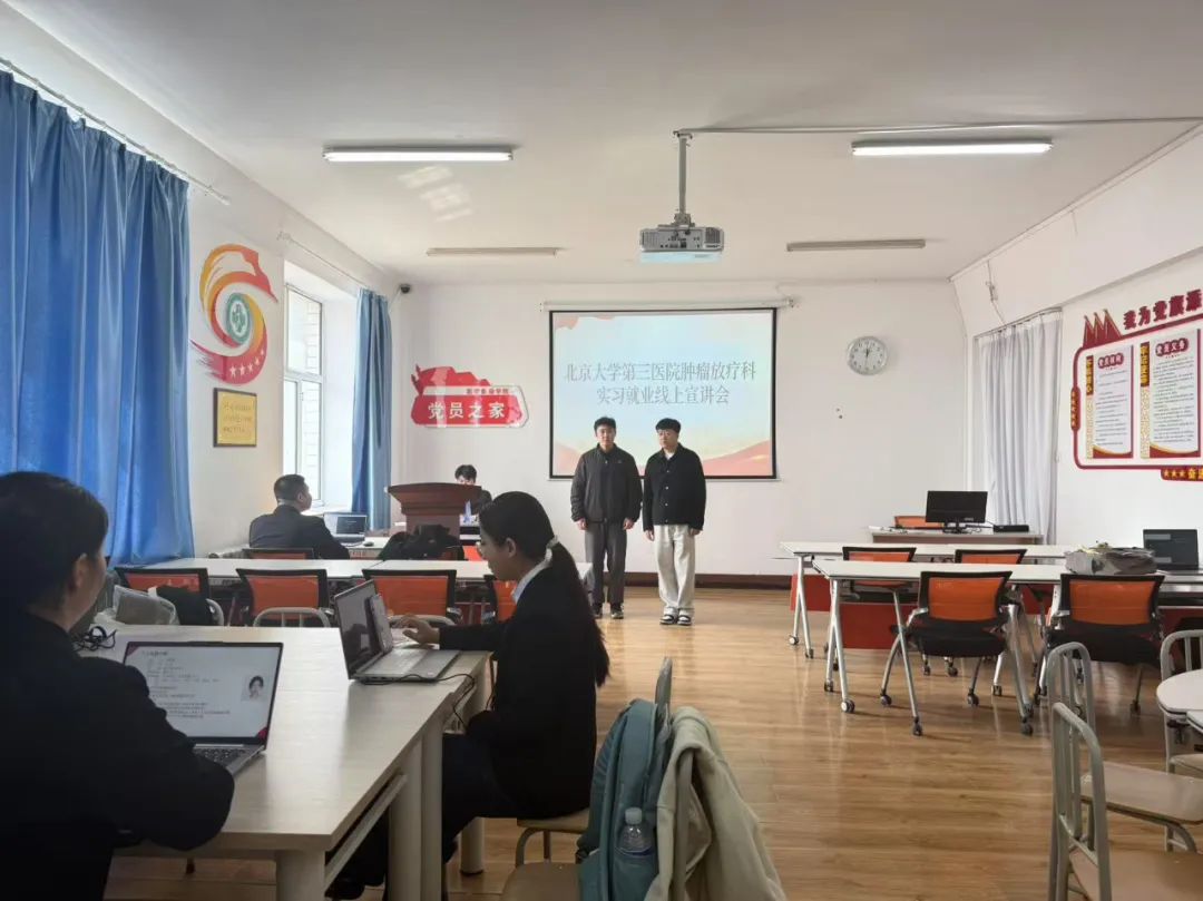 为进一步深化校院合作,巩固高质量实习基地建设,拓宽学生就业渠道,2025年04月09日,医学影像学院在影像办公楼三楼党员之家举办北京大学第三医院肿瘤放疗科实习就业线上宣讲会。学院实习就业科负责人赵春阳、辅导员李英翰及学生代表参会,北京大学第三医院肿瘤放疗科主任王俊杰带领科室管理团队出席活动。