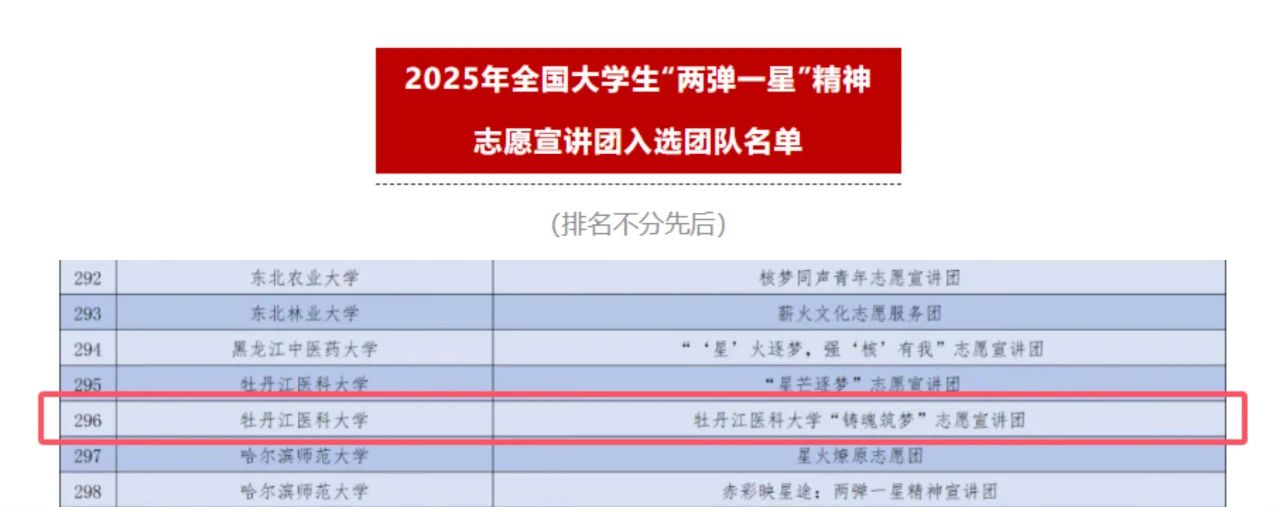 为深入学习宣传贯彻习近平新时代中国特色社会主义思想,全面贯彻党的二十大和二十届二中、三中全会精神,引导新时代广大青年学生坚定爱国报国信念,大力弘扬与传承“两弹一星”精神,激发广大青年投身强核强国事业的热情,团中央青年志愿者行动指导中心与中国核工业集团有限公司联合发布了《关于遴选2025年全国大学生“两弹一星”精神志愿宣讲团的公告》。活动得到了各高校志愿服务团队的广泛关注和积极参与。近日,选拔活动评选结果公布,“铸魂筑梦”志愿服务队再次光荣入选,这是继全国大学生关爱行动“七彩假期”志愿服务团、“中国历代绘画大系”志愿宣讲团、关爱行动“少年儿童安全守护计划”管道保护宣传志愿服务团和“沂蒙精神”志愿宣讲团后“铸魂筑梦”志愿服务队第五次入选全国大学生志愿服务团队!