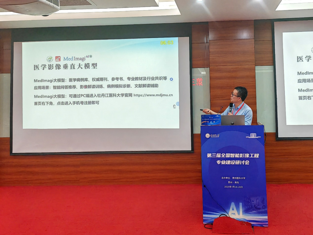 医学影像学院院长于广浩受邀做题为“智能影像工程专业建设实践与探索”的报告,向大会分享了我校招生两年来所做的具体工作。报告中,于广浩隆重向大家推荐我校刚刚发布的“MedImagi医学影像垂直大模型”,详细介绍了MedImagi大模型的功能模块、应用场景以及如何赋能医学影像“教”与“学”,并欢迎大家积极使用,提出宝贵的意见和建议,帮助完善MedImagi大模型,助力医学影像人才培养。