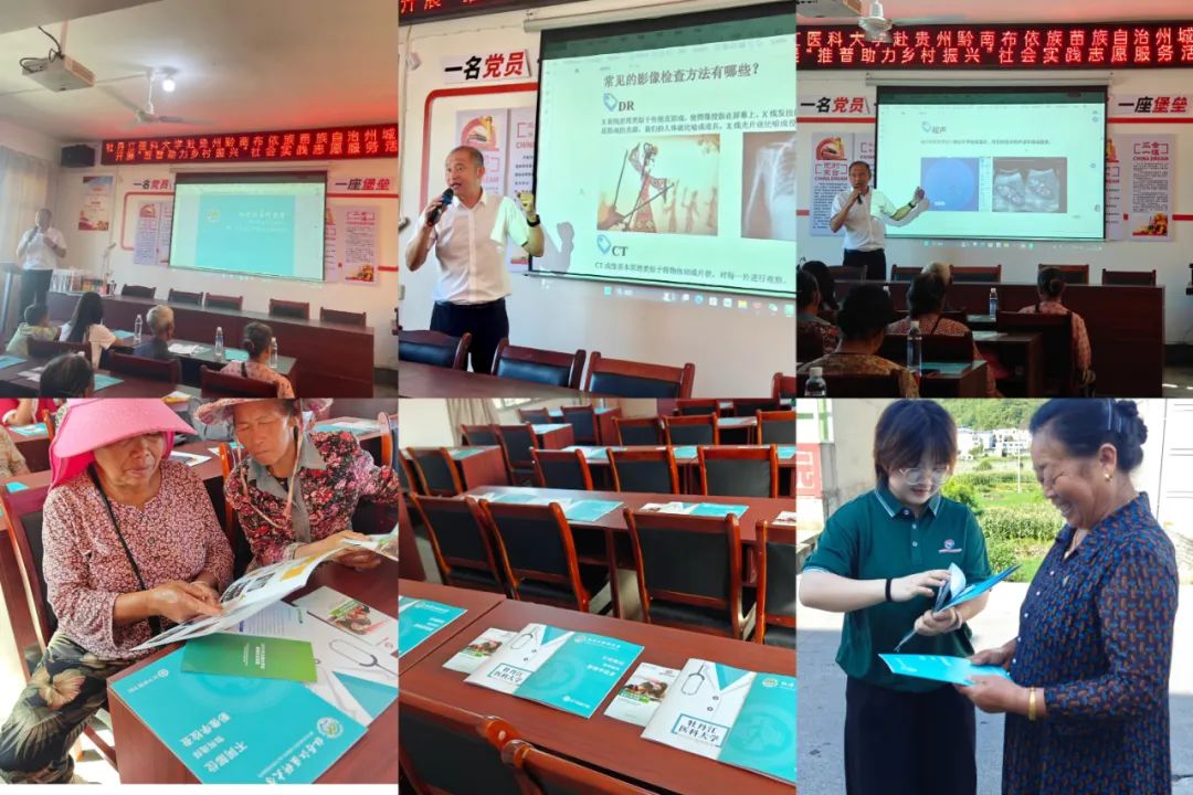 健康义诊惠民生,影像科普破盲区。将专业特色融入到实践和志愿服务中一直是团队始终如一的追求。针对当地村民老龄化严重,基础医疗知识相对匮乏这一实际情况,医学影像学院专门制作了《不同部位如何选择影像学检查》科普宣传手册,学院党委书记徐永良利用通俗的语言将宣传手册中的影像检查方法、原理及注意事项等为当地村民进行详细讲解,受到村民们的热烈欢迎。