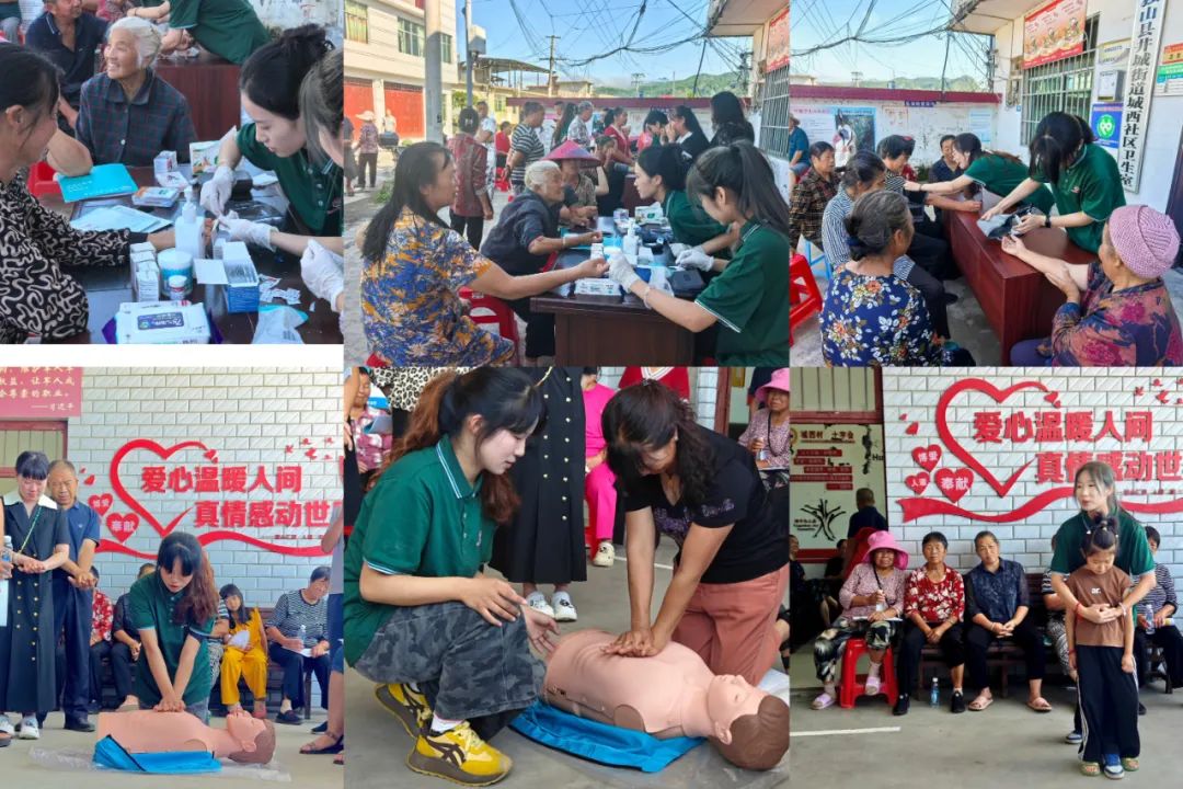 医疗技能深植乡,医卫关怀入乡门。知识普及之余,团队更注重实用技能的传授。志愿者们在村活动中心设立健康服务点,为村民提供血压血糖健康检测;并在活动现场为村民们详细讲解并演示了海姆立克急救法和心肺复苏术,指导村民进行模拟操作,让这些关键时刻能救命的技能真正在乡村扎根。此外,志愿者们分组深入村寨,走家串户,将医学健康知识宣传册和普通话推广材料送到村民手中,特别是为行动不便的老人提供面对面的健康咨询和普通话宣传服务,传递关怀。