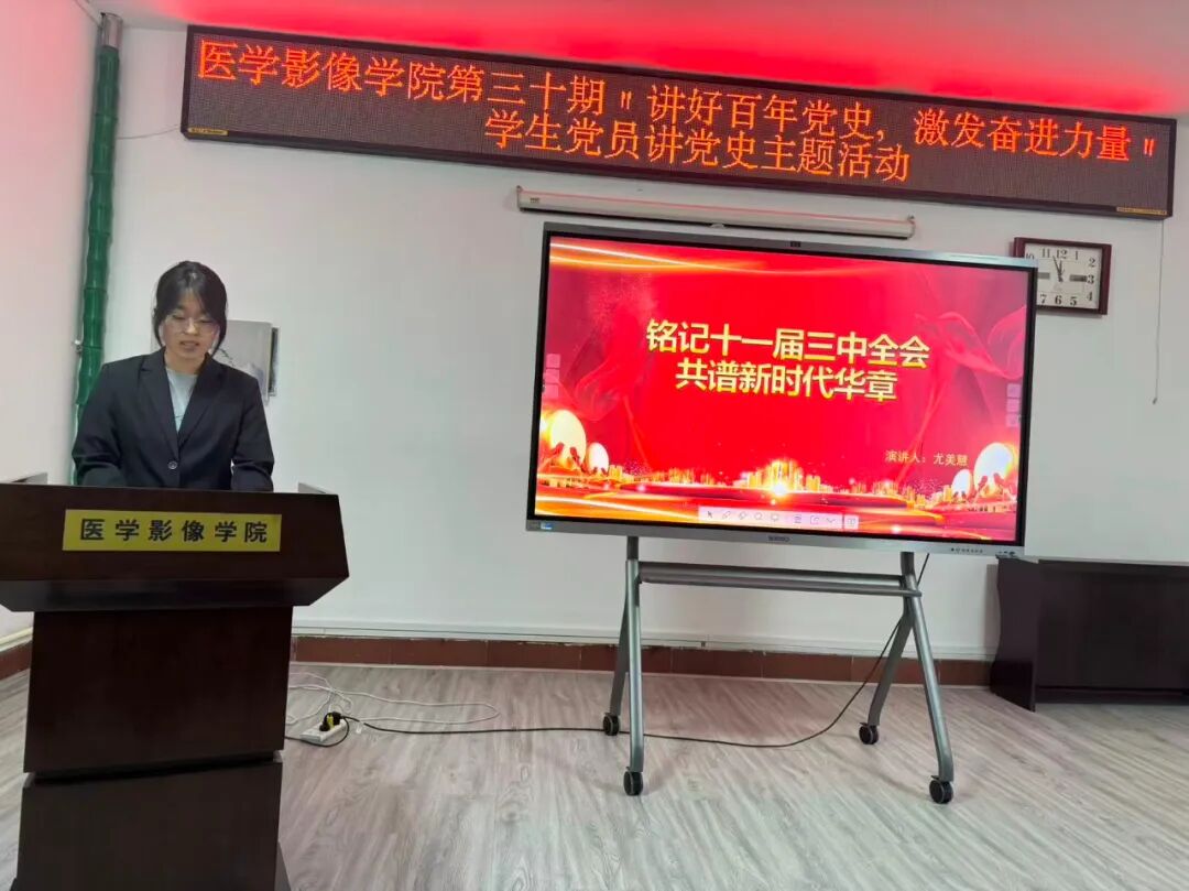 本期活动由医学影像学院学生预备党员尤美慧担任主讲人,她以《铭记党的十一届三中全会,共谱新时代华章》为主题,带来一场绘声绘色,声情并茂的党史学习教育宣讲。尤美慧同学从党的十一届三中全会的思想背景,伟大转折,改革成果,时代传承四个方面为我们全面地讲述了党的十一届三中全会。她重点回顾了党的十一届三中全会前期我们国家处于一个怎样的时代背景“党和国家的工作陷入了徘徊中前进的局面“以及从农村突破向城市拓展开办经济特区的改革方式之精准,改革态度之坚定,改革成果之翻天覆地。生动诠释了改革开放精神的核心内涵。尤美慧在演讲中强调改革开放精神是中国共产党在改革开放实践中形成的宝贵精神财富,我们要以改革开放精神为指引,在新时代,铭记党的十一届三中全会的历史功绩,传承和弘扬改革开放精神,坚定理想信念,勇于担当作为,为实现中华民族伟大复兴的中国梦而努力奋斗。