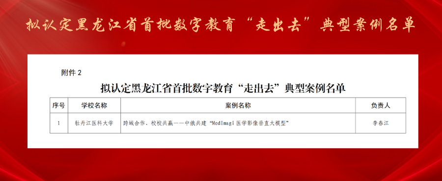 近日,黑龙江省教育厅正式公示首批数字教育“走出去”典型案例名单,我校申报的《跨域合作、校校共赢——中俄共建“MedImagi医学影像垂直大模型”》项目凭借创新模式与实践成效成功入选,成为全省数字教育对外合作的标杆案例之一。