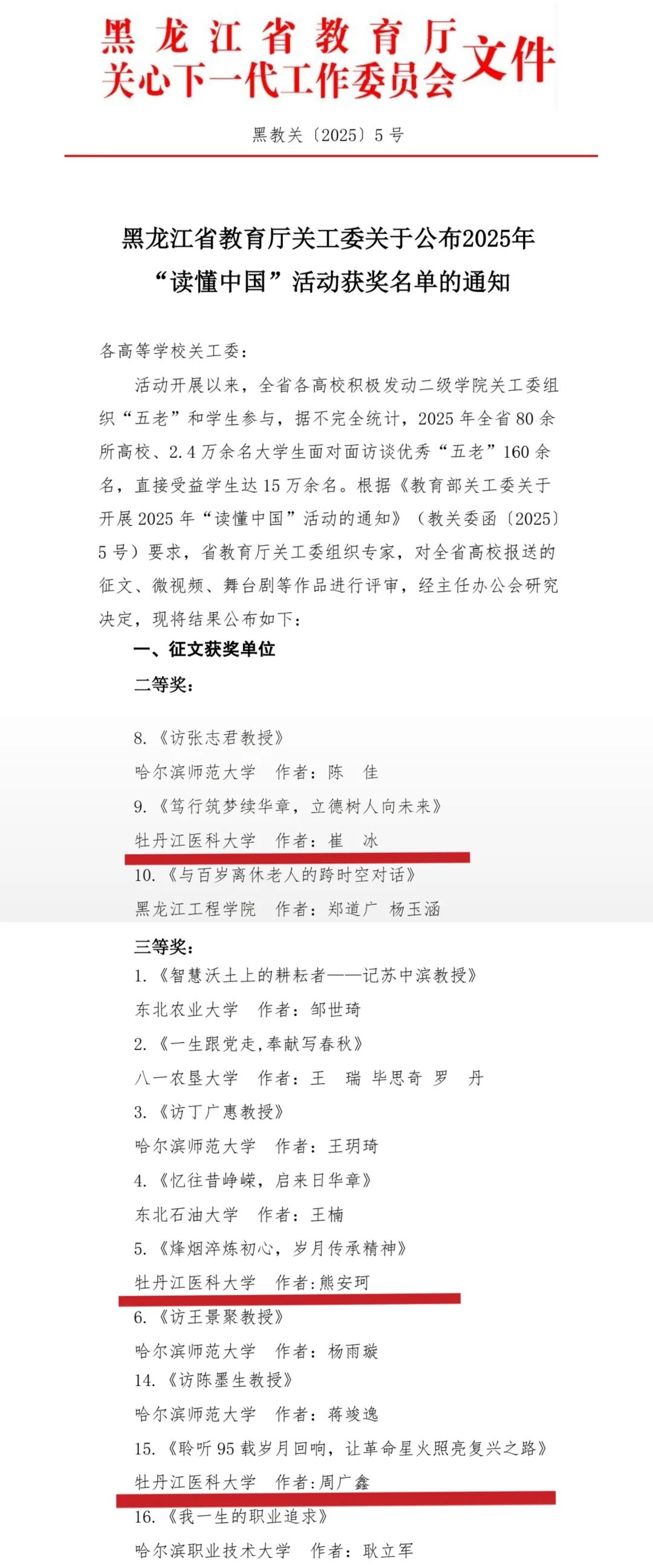 近日,黑龙江省教育厅关工委关于公布了2025年“读懂中国”活动获奖名单,我校医学影像学院教师宋海南指导学生崔冰选送的征文《笃行筑梦续华章,立德树人向未来》获得二等奖,基础医学院教师万雷指导的学生熊安珂征文《烽烟淬炼初心,岁月传承精神》,第一临床医学院教师李玉梅指导的学生周广鑫征文《聆听95载岁月回响,让革命星火照亮复兴之路》分获三等奖。