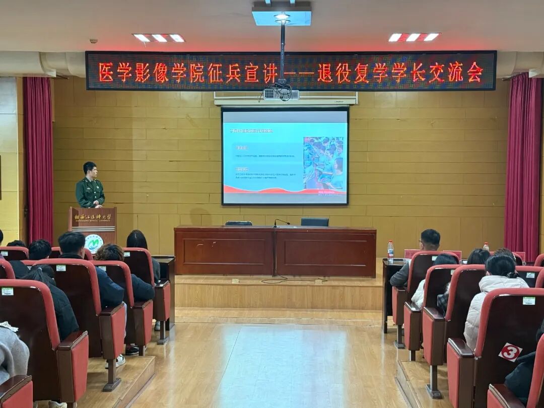 为贯彻落实强军精神,引导青年学子积极投身国防事业、响应国家号召,我院于2025年12月12日下午在学校“一站式”学生社区图书馆求是讲坛举办“征兵宣讲——退役复学学长交流会”主题宣讲活动。本次活动特邀请我院优秀退伍大学生舒洪博担任主讲人,全方位解读征兵相关政策,分享军旅生涯的意义与感悟。医学影像学院院长于广浩、党委副书记宋海南、学工办(团委)主任(书记)仲昭奇共同参与本次活动。