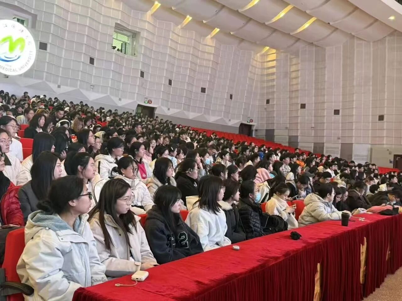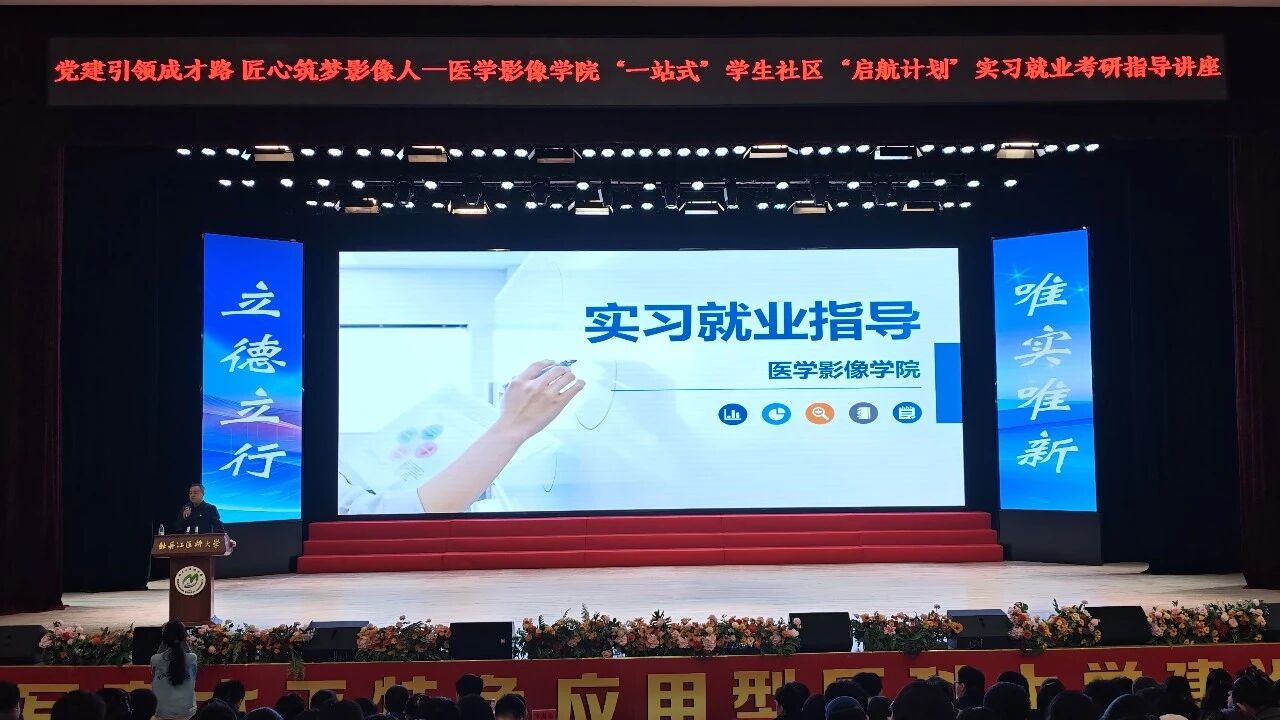 为树立和践行正确政绩观,深入推进党建引领育人工作,切实助力学子明晰实习就业与考研方向、缓解成长焦虑。2026年4月9日,医学影像学院“一站式”学生社区“启航计划”实习就业考研指导讲座顺利举行。学院党委副书记宋海南、实习就业科科长赵春阳、学工办(团委)副主任(副书记)彭博伟及辅导员李英翰、徐倩男出席,2022级、2023级近1100名学生参加活动。