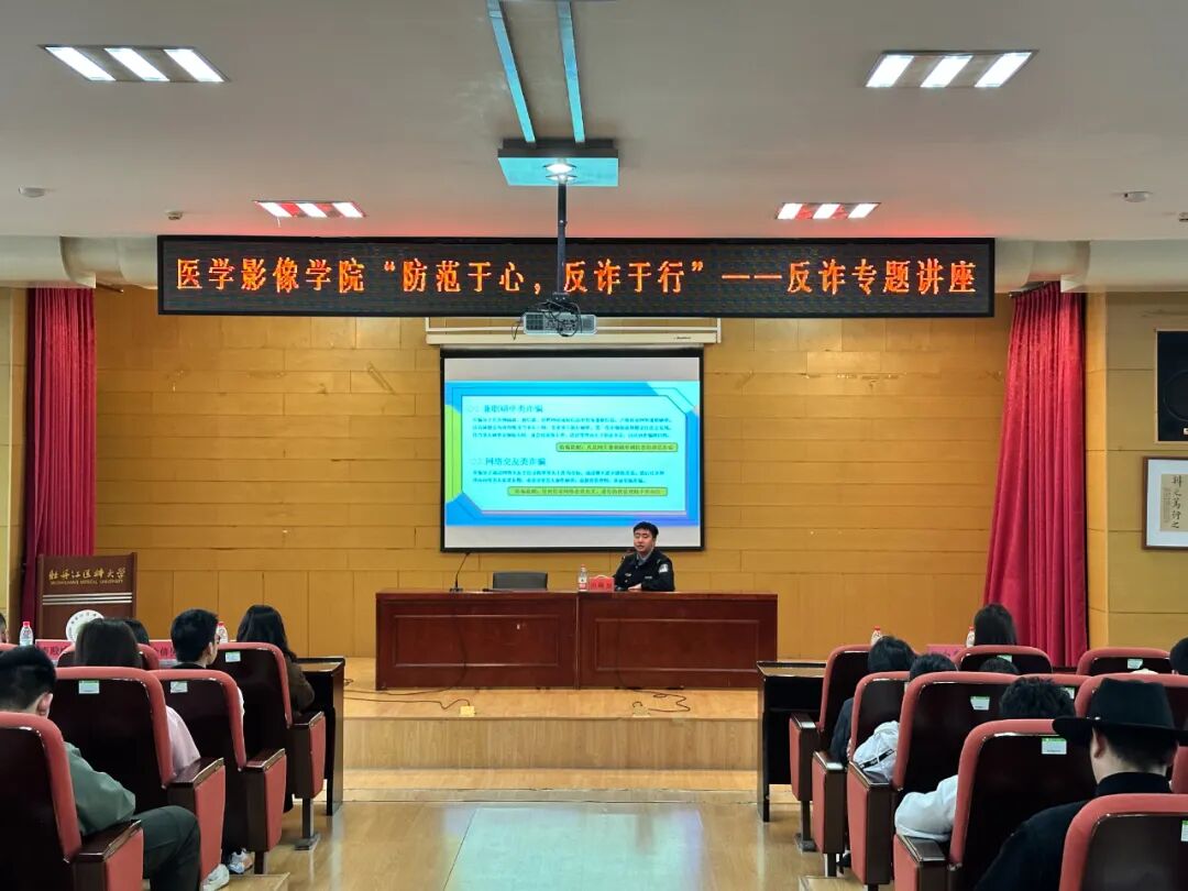 2026 年 4 月 17 日下午,医学影像学院在学校 “一站式” 学生社区图书馆四楼求是讲坛,开展 “防范于心,反诈于行” 反诈专题讲座。本次讲座特邀牡丹江市公安局爱民分局向阳派出所田峰旭警官主讲,学院学工办(团委)副主任(副书记)彭博伟、辅导员徐倩男、李殿威参加活动。