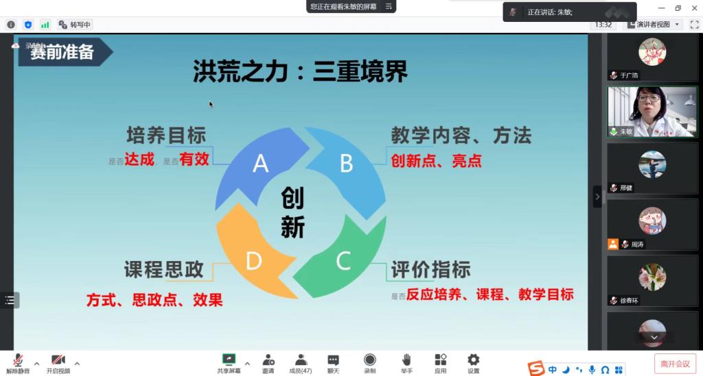 本次讲座朱敏教授主要从大赛简介、赛前准备、赛中提升和赛后感悟四个方面与大家分享了自己准备比赛的艰辛过程及参赛的心得体会。阐述了如何认识大赛、如何准备大赛;什么是创新、怎么创新,创新如何为培养目标服务;如果培养家国情怀,怎样在教学中融入思政元素;如何一点一滴的积累教学经验及创新素材……介绍了教学创新大赛对于推动教学创新,培养一流人才的重要意义。提出高校教师潜心教书育人,进行教学改革必须踏踏实实从头做起,创新教学模式既要“骨架”完整,又要“气血”充足。