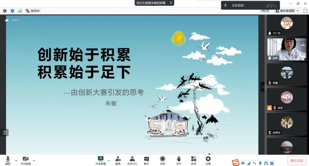 2022年11月03日15时10分,医学影像学院线上举办“喜迎二十大 奋进新征程”教学沙龙系列活动第二期,本期由影像诊断学教研室副主任、硕士研究生导师朱敏教授主讲,主题为“创新始于积累 积累始于足下—由创新大赛引发的思考”,活动由医学影像学院副院长于广浩主持,医学影像学院党委书记潘艳明、院长邢健、副院长李芳巍及学院无课教师同步参与,公共卫生学院副院长刘凤海教授、马克思主义学院副院长杨帆副教授列席活动。