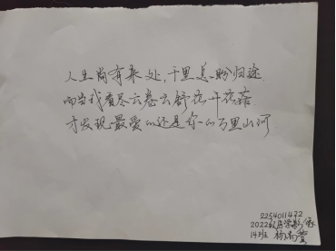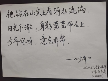 在比赛过程中,同学们踊跃参加,文采飞扬,执笔写诗。从诗歌中我们体会到了历史变迁,从诗歌中我们体会到了风土人情,从诗歌中我们领略到了祖国的壮丽河山。文字无声,却能表达万千情绪,短短三行诗句描绘出的是丰富多彩的内心世界。