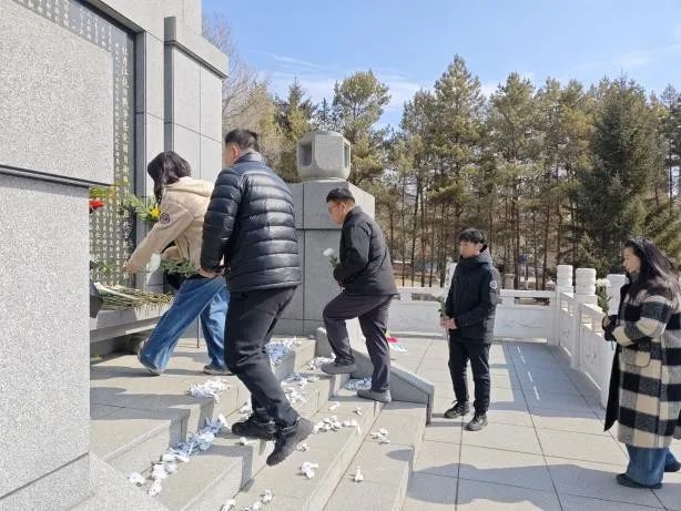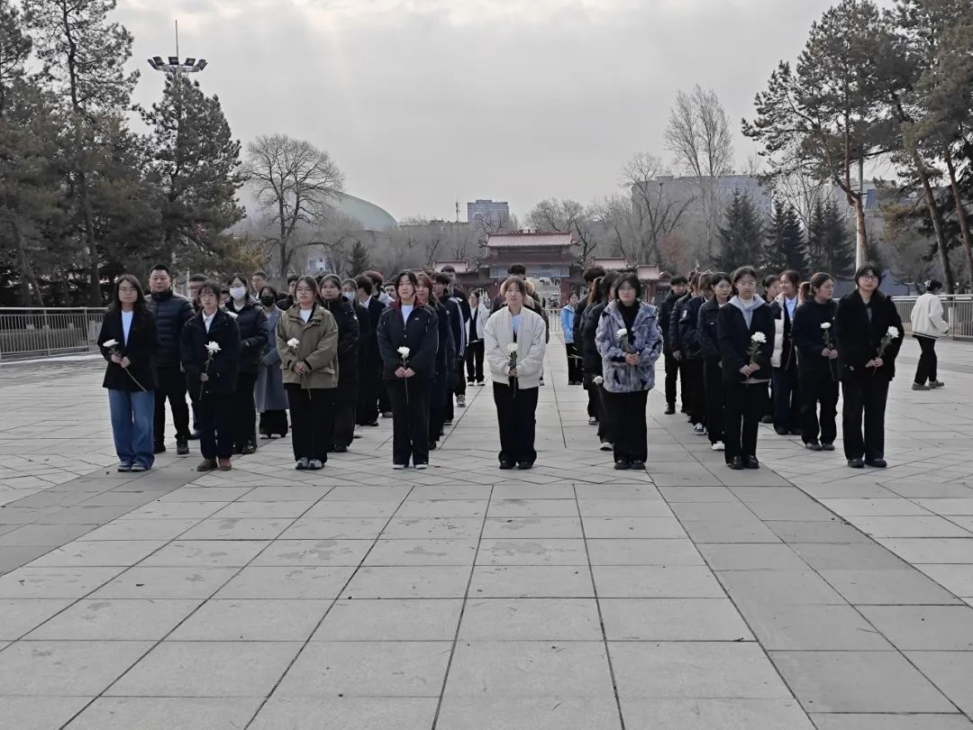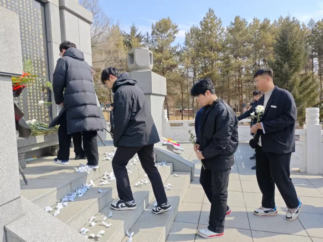 活动当天,医学影像学院师生代表整齐列队抵达北山公园抗日战争烈士纪念碑,手捧白菊,肃穆静立于纪念碑前。在这庄严而神圣的地方,师生代表依次前行,将白菊轻轻置于纪念碑基座,待归队后,全场肃立,为革命烈士默哀。在这静谧的时间里,所有人的思绪都飘回到那段战火纷飞、山河破碎的岁月,向为民族独立、人民解放和国家富强英勇献身的英烈致以无限追思。随后,辅导员李殿威发表讲话,他强调祭扫活动不仅是为了回顾历史,更是为了启迪未来,希望影像学子将红色基因融入血脉,继承和发扬先烈的伟大精神,在新时代的大潮中,坚守初心,砥砺前行。