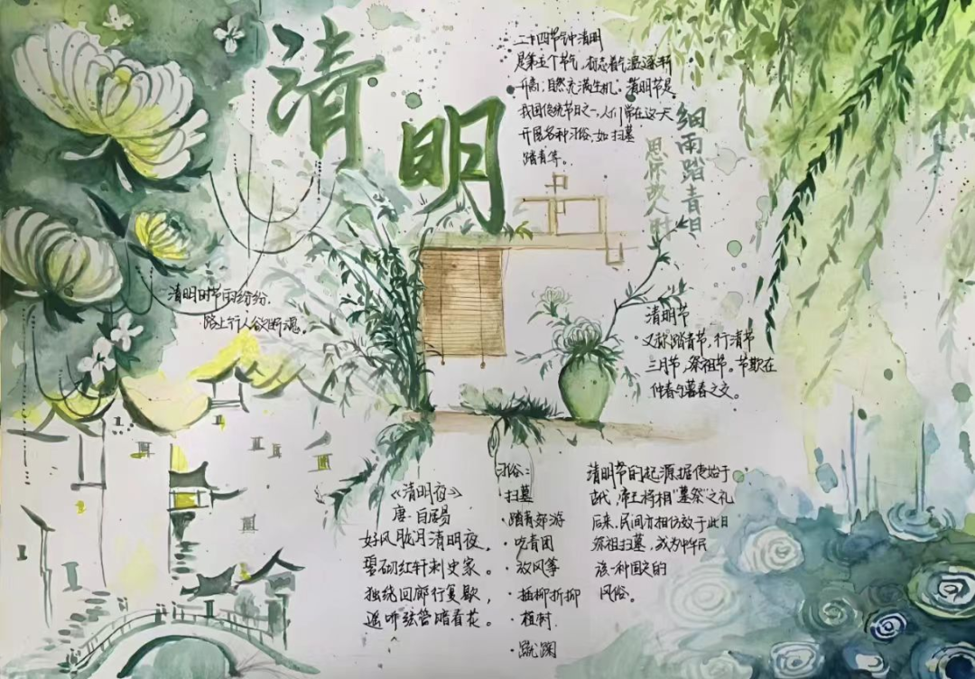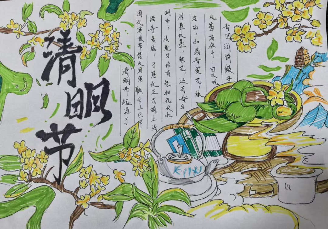 参赛作品以多元视角展现清明文化魅力:既有《清明上河图》式的全景描绘——青烟袅袅的墓园里,手持白菊的祭扫者肃穆行礼;也有《寒食宴饮图》的温馨场景,青团、撒子等时令美食跃然纸上;更不乏《春日游园图》的盎然生机,远山含翠,桃杏争艳,纸鸢乘风。同学们以丹青为媒,将慎终追远的人文精神与万物清明的自然意趣巧妙融合。