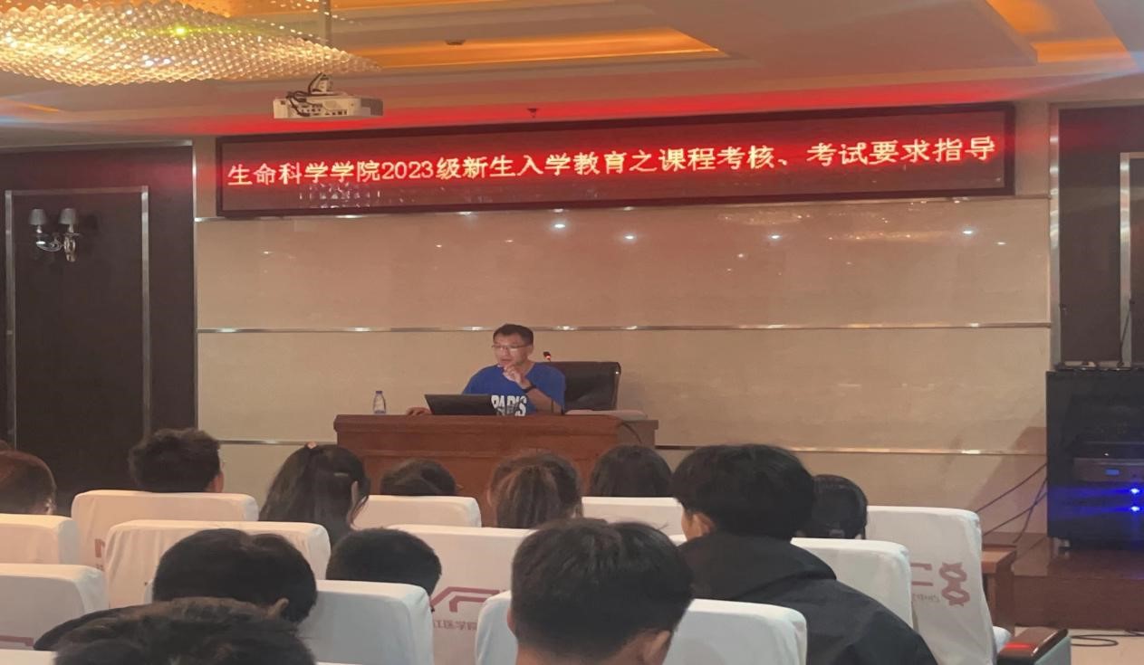 为使2023级新生树牢专业自信,推动新生端正学习态度,提升学业能力,强化诚信行为意识,生命科学学院于 2023 年 9 月 14日晚六时,在医药研究中心六楼会议室开展2023 级本科新生入学教育——课程考核、考试要求指导。活动由学工办副主任付小达老师主持,学院教务科科长尹永奎博士讲座,全体2023级本科新生参加了本次活动。